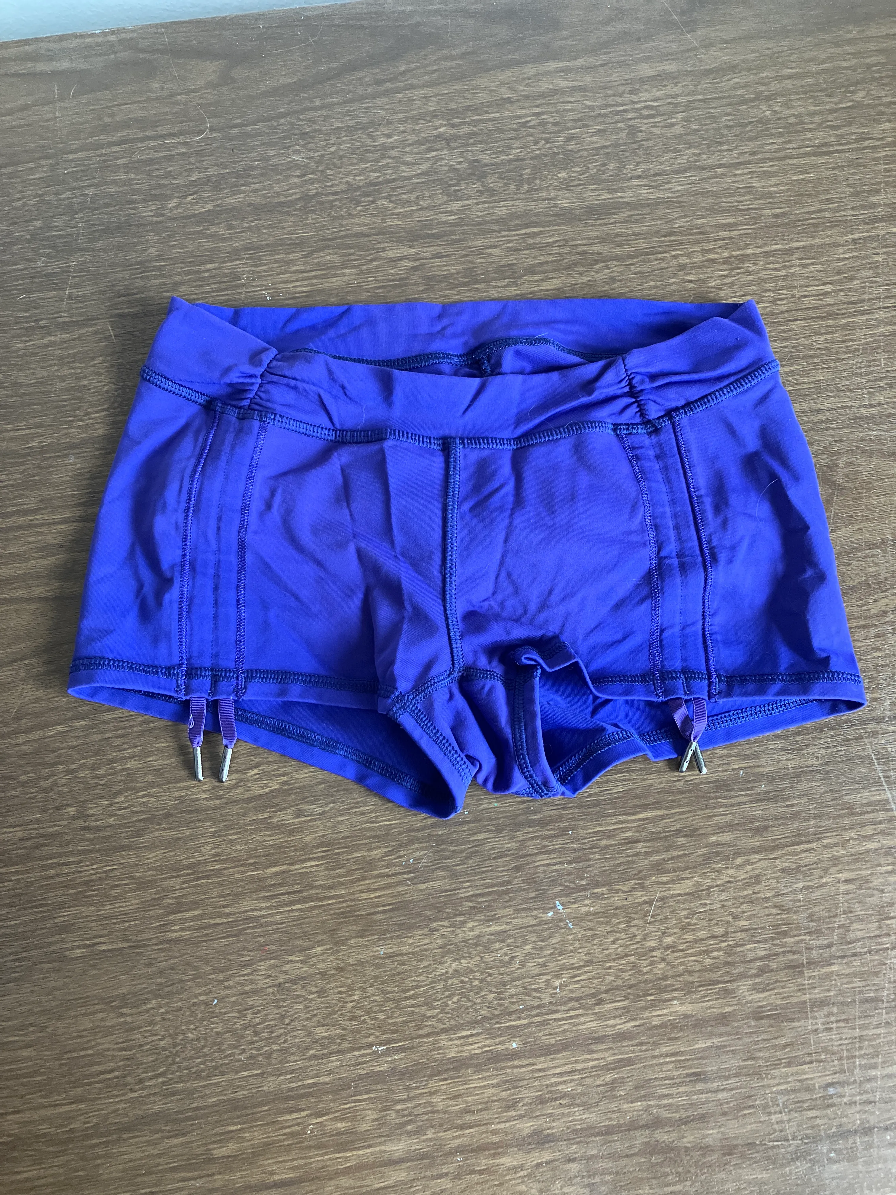 It does not have its size written but I believe it fits XS to S as that is my size and these fits perfectly. The crotch has a cloth lined so you can wear without underwear as an option. The colour is more like a purple than the picture shown. It is not blue, but blueish purple!