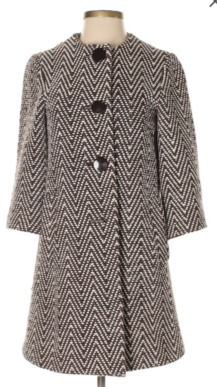 Very elegant, the sleeves stop half way on the forearm. Super chic with a long pair of leather gloves. Brown and white zigzag design. Mid thigh length. Jacky Kennedy style jacket