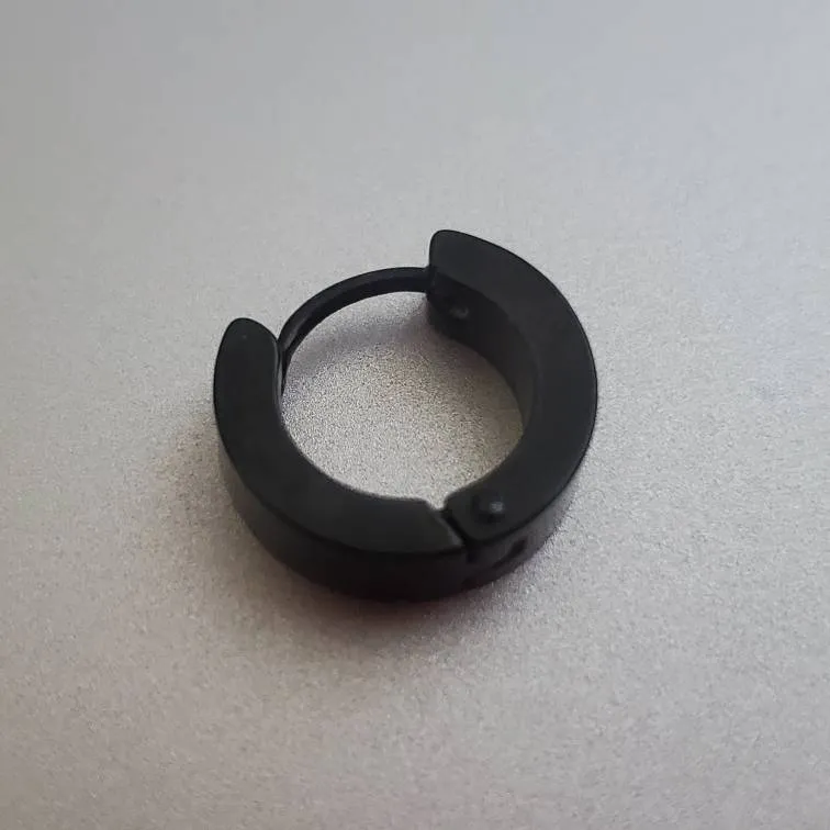 Single matte black mini hoop earring. Has been disinfected in rubbing alcohol, but I'd still recommend the next owner to resterilize it again just prior to use.