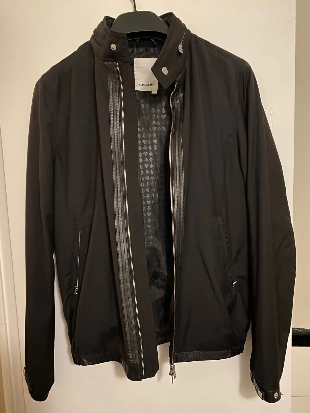 Men’s J.Lindeberg jacket, size medium. Used, but good condition. Jacket is a thin wool blend with leather (faux?) trim and a zip-away hood. Great for spring 👍🏻