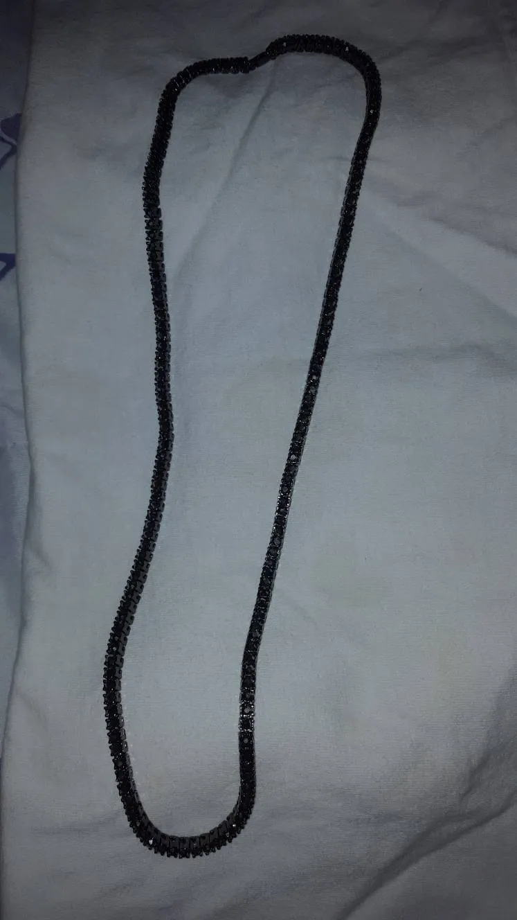 Long necklace, super blingy with black stones. The necklace is a grey black tone, the bracelet is ball with black stones as well and simple black stones stud earrings.