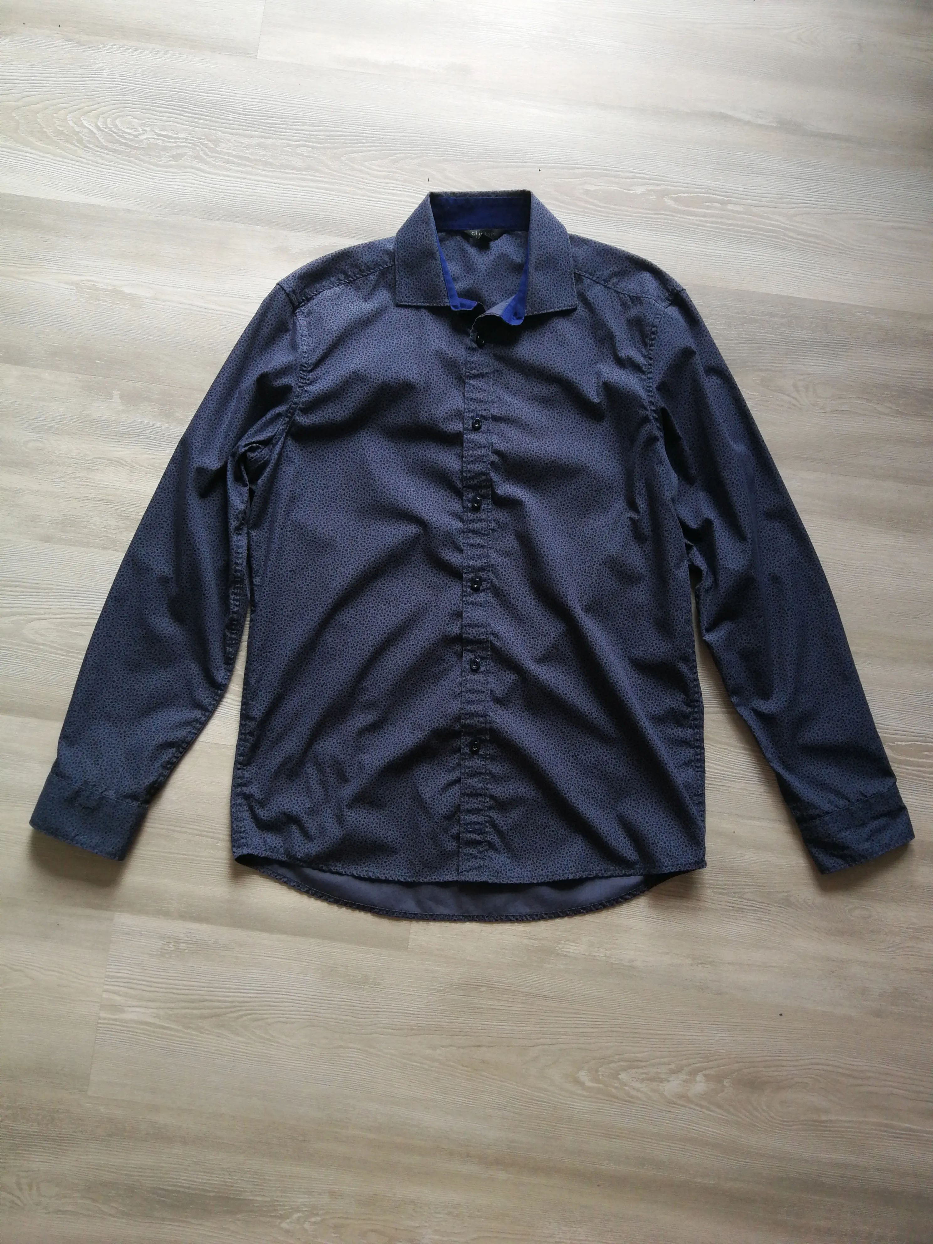 Dark blue dress shirt with tiny flowers pattern. The fabric is wrinkle resistant so barely needs any ironing. It's a medium but on the bigger side. The brand is CityLife.