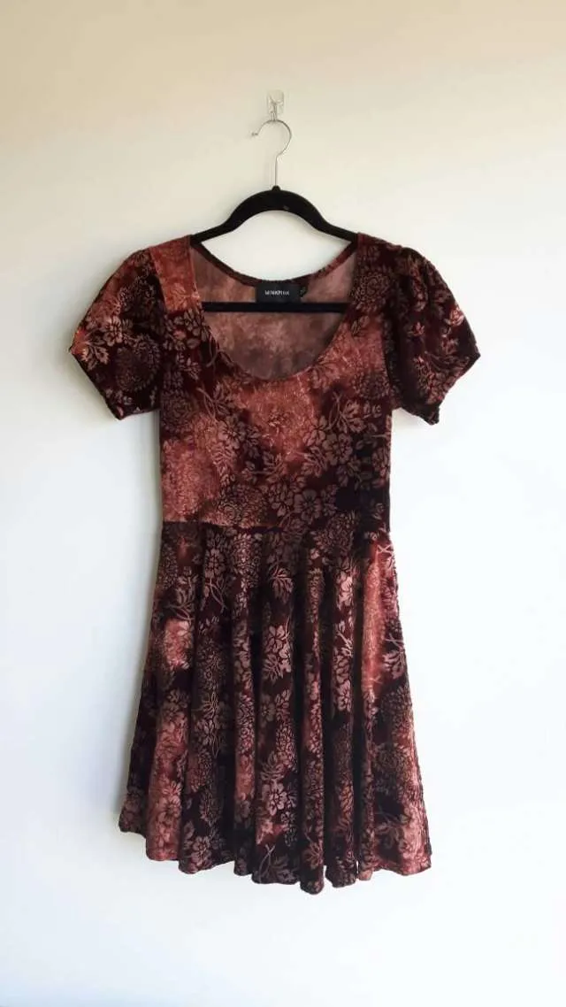 Super cute dress with a cut velvet paisley design and princess sleeves. Hits just above the knee.