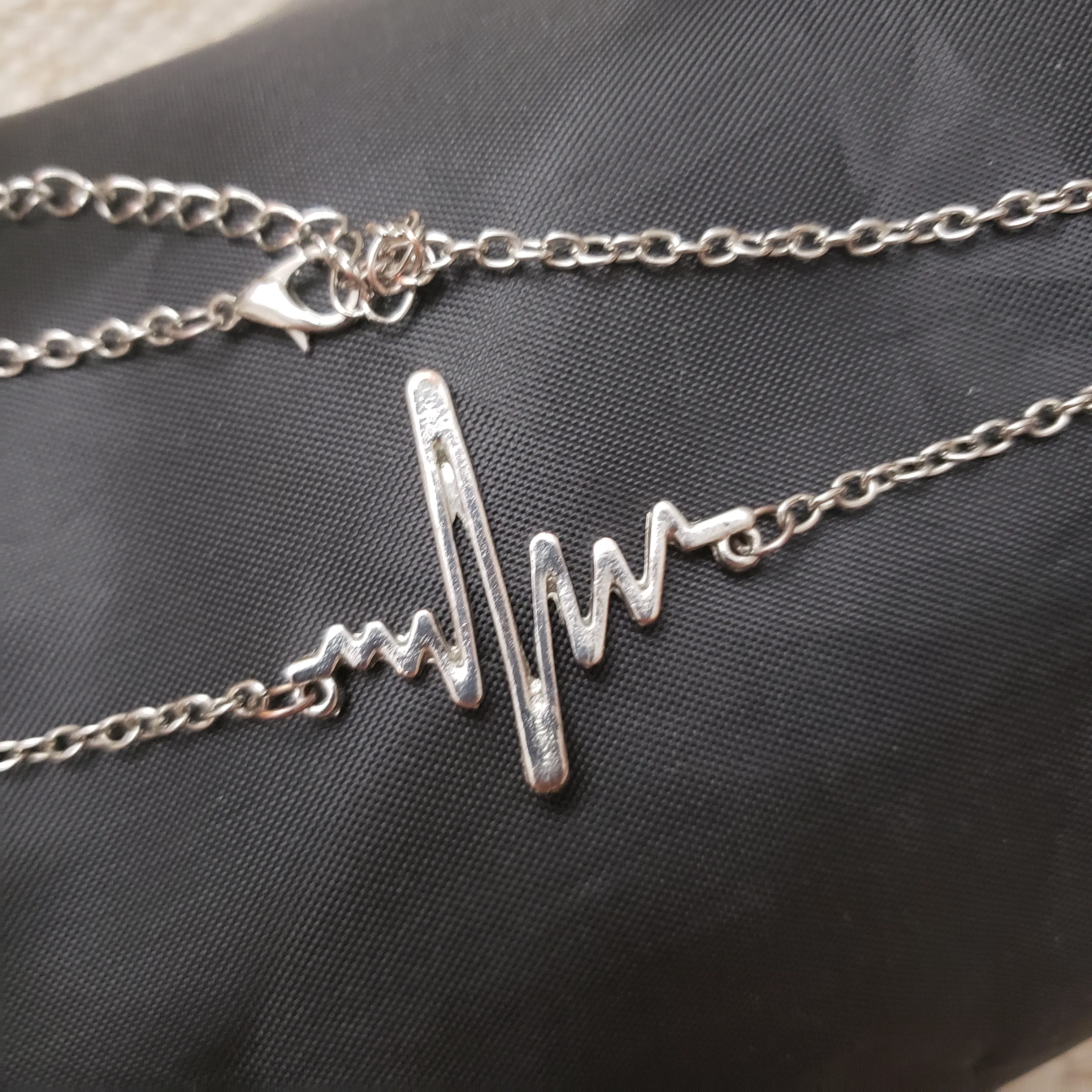 Silver color metal, costume jewelry. Can be worn front and back. I thought it represented a heart beat as a reminder that as long as I'm alive, I'm going to be okay. Trading as my style changes.