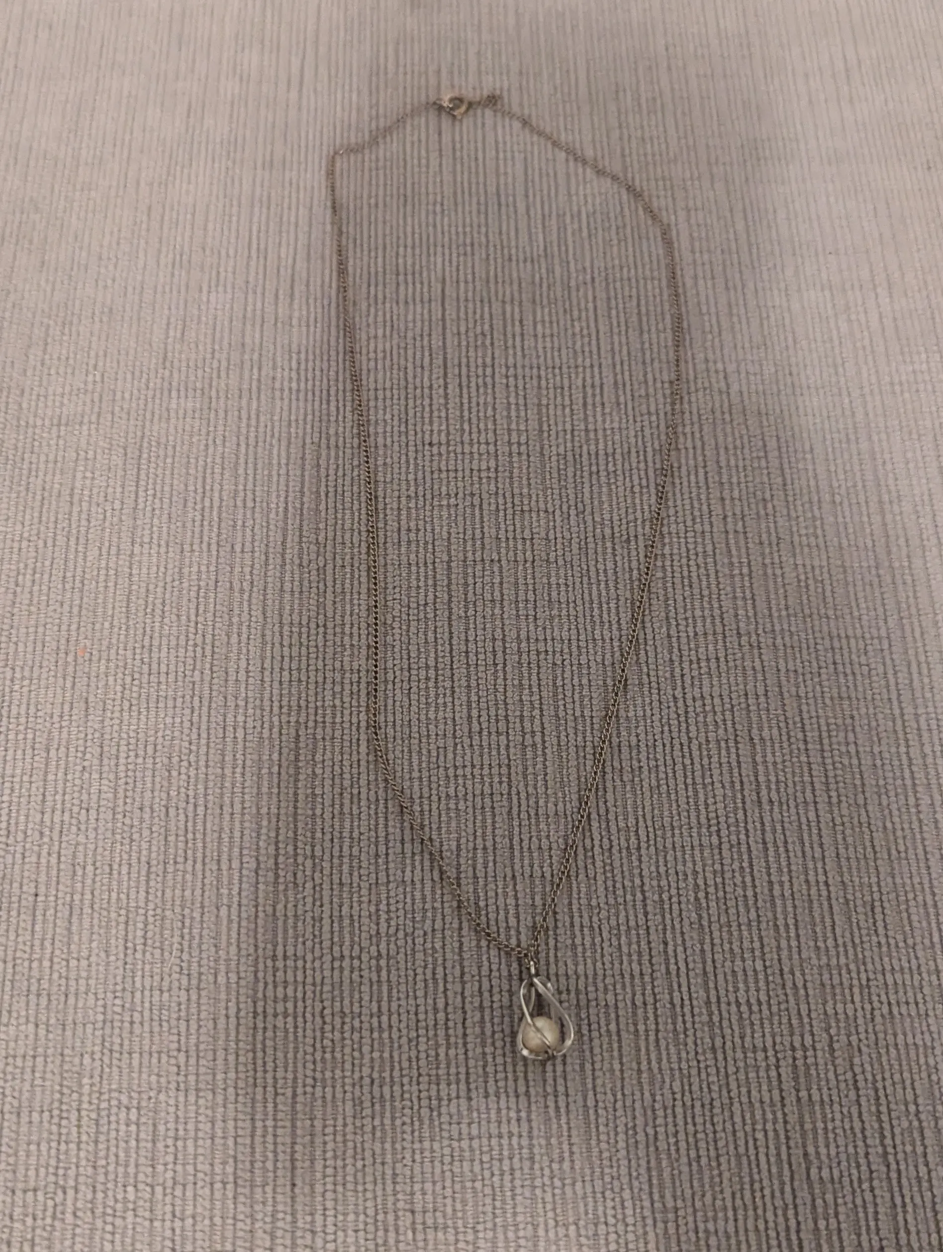 Necklace featuring a single pearl. Silver-toned chain and pendant. Simple, elegant design. Perfect for everyday wear.