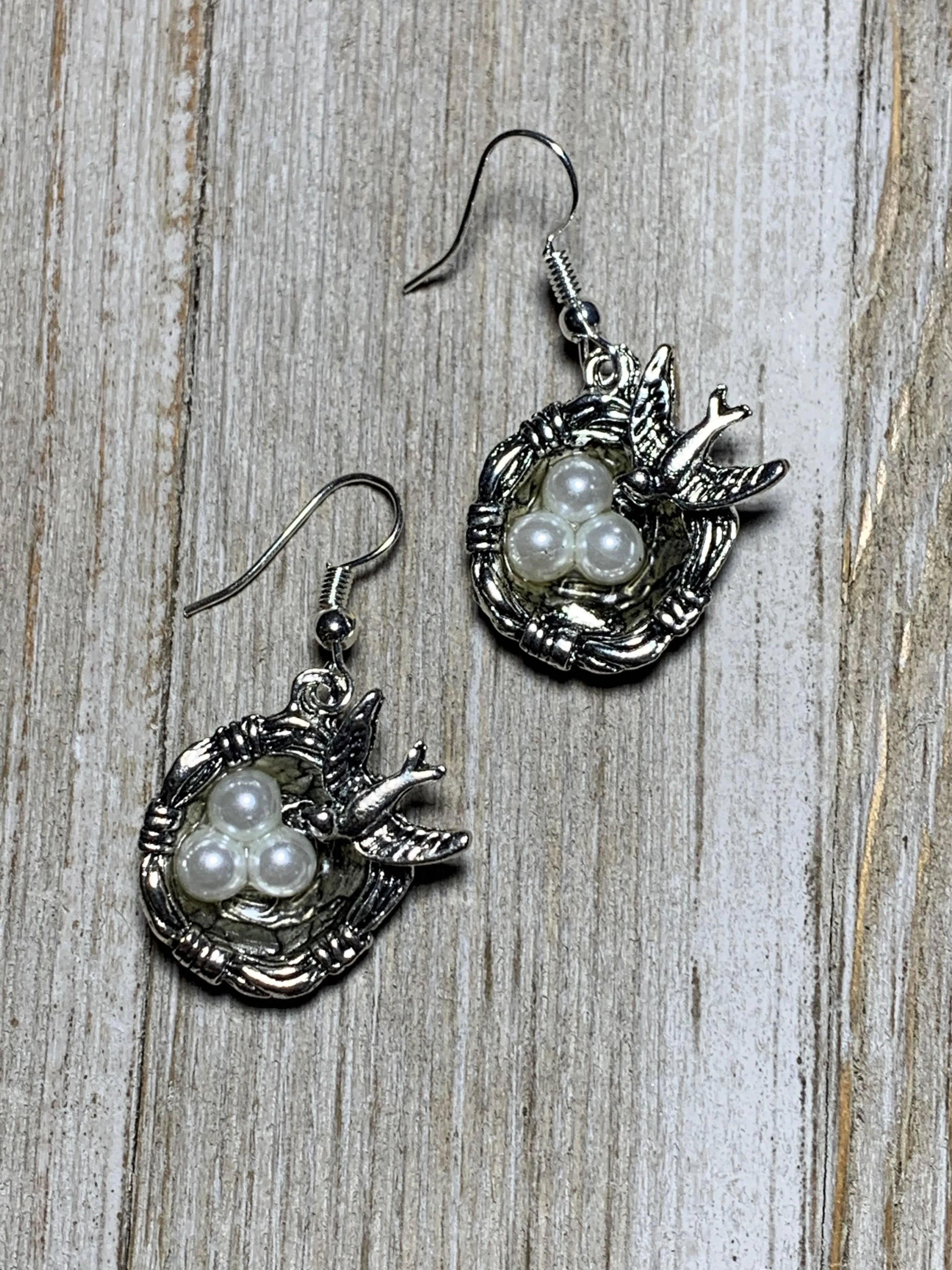 Each nest holds 3 pearlized bead 'eggs' with a doting bird perched on the nest. These bird earrings would be a really tweet, I mean 'sweet', gift!