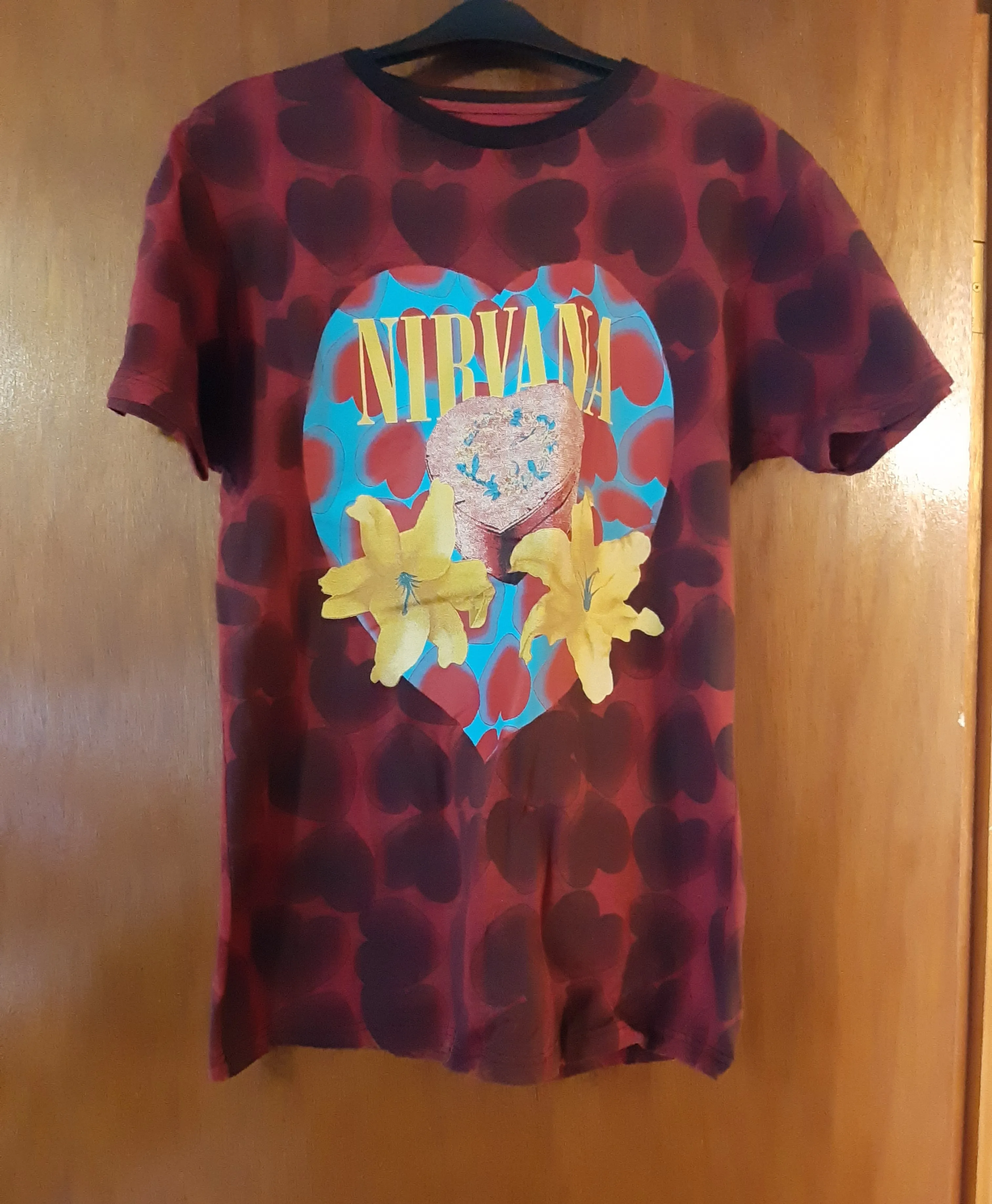 AMAZING double sided Nirvana Heart Shaped Box + In Utero print tshirt. Purchased from their website in 2016 and likely only worn a handful of times at most. Size large, because of the all over print hearts and the large heart shaped prints on tops of them, the texture of the shirt is quite stiff, but will likely soften over time and with wear.