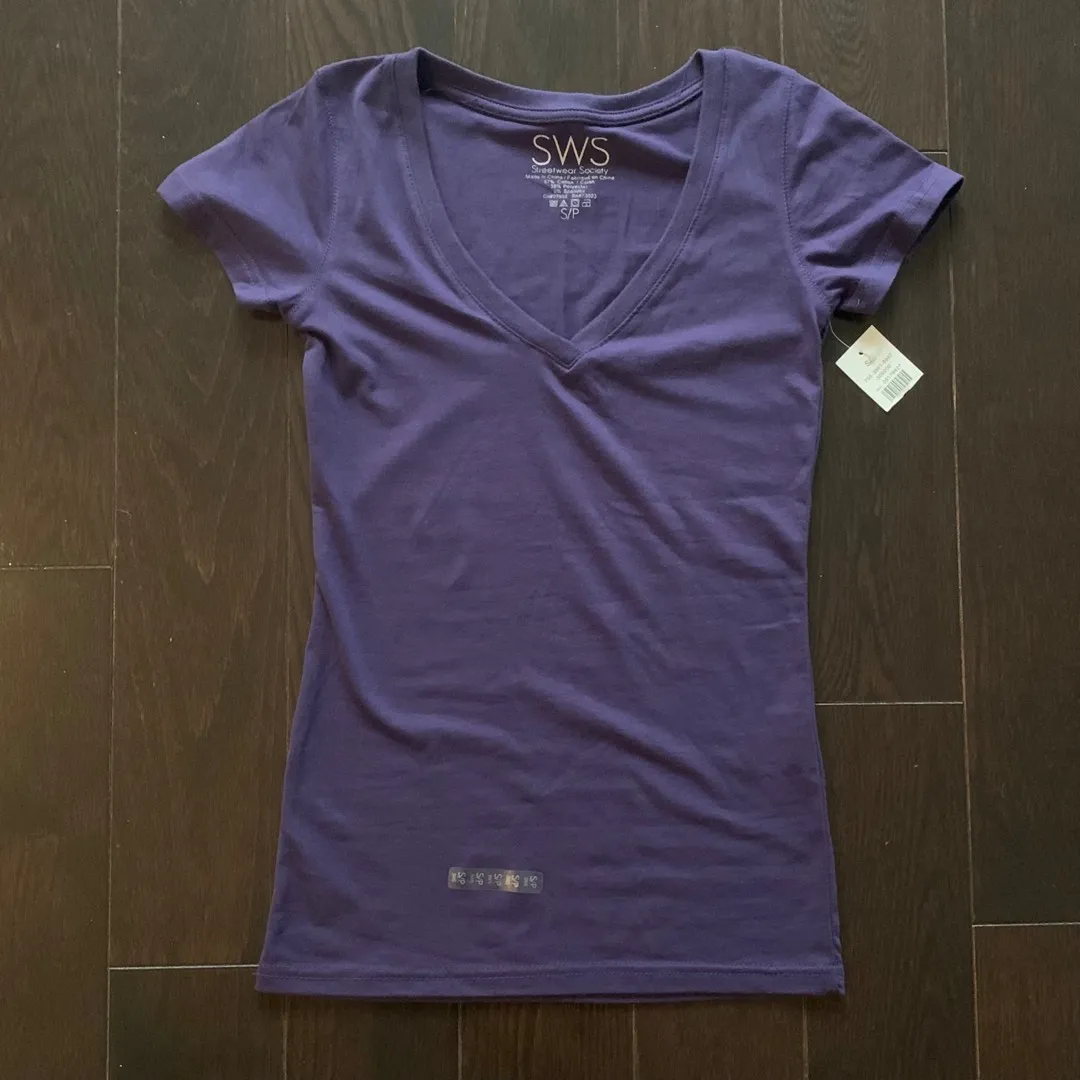 New with tags dark purple quality v-neck women’s shirt. Size is small but has stretch, fits me and I’m a medium/8.