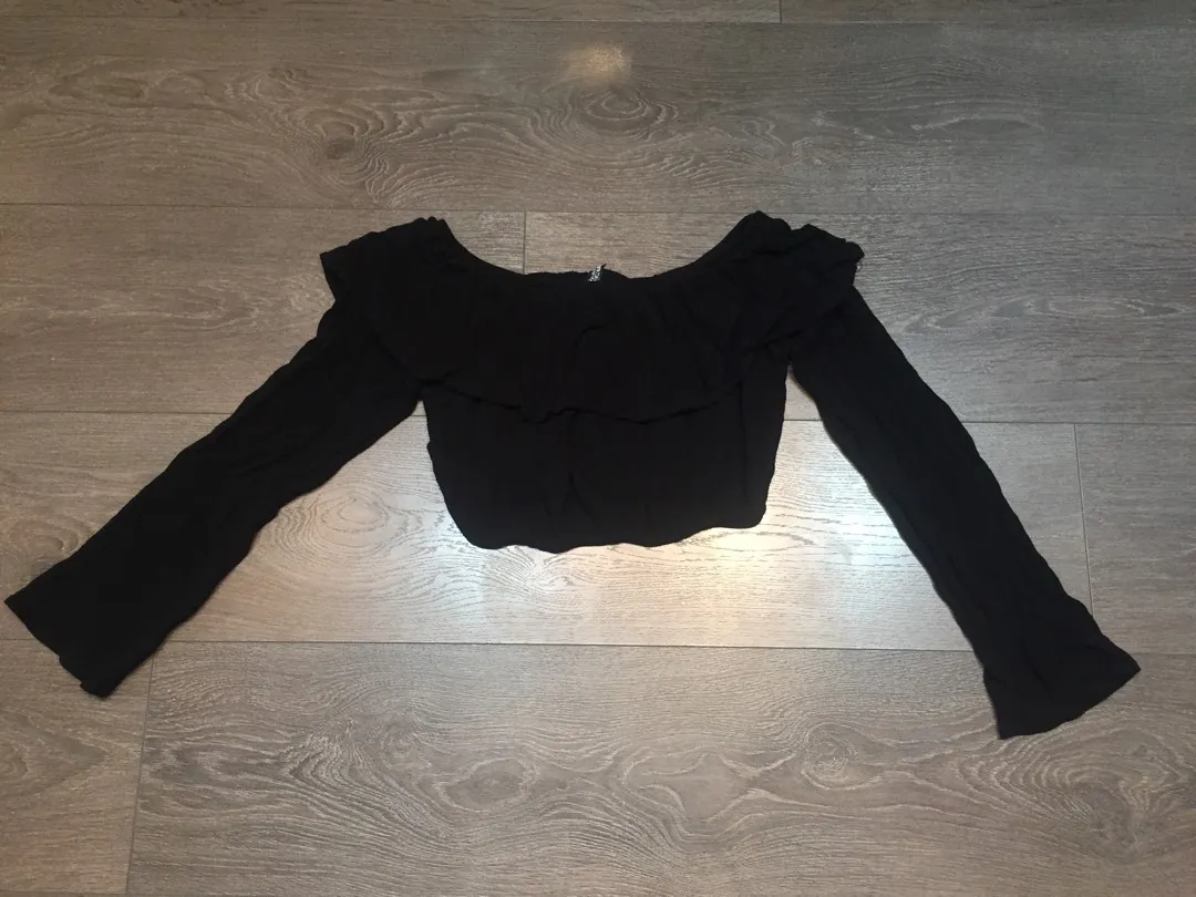Side small, cute ruffle detail on top. Pairs well with high waited jeans and sneakers ✨