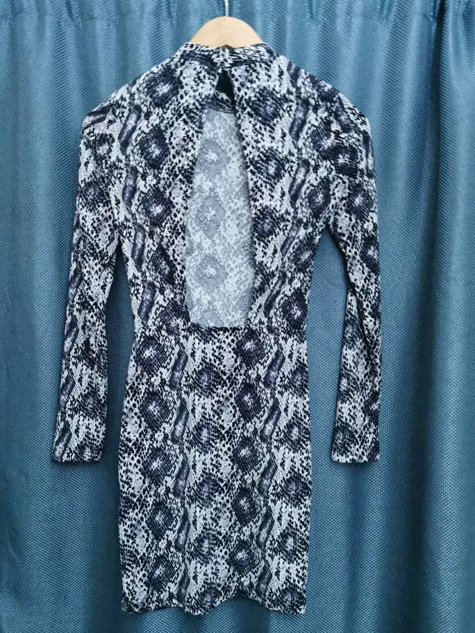 Indigo snake skin print dress Size 0 but super stretchy(h&m sizing 🙄). Typically, I am a size 4 or 6 and this fits!