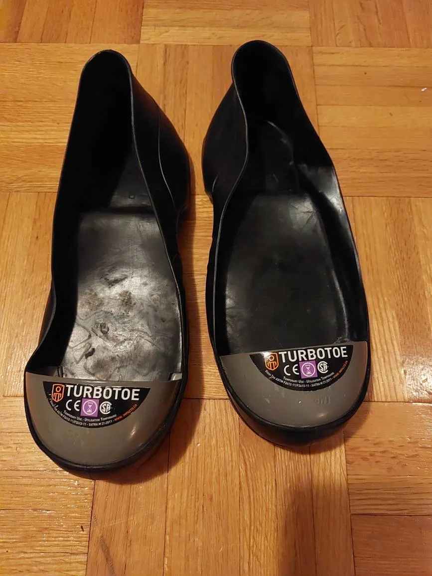 Rubber and steel toe, goes over your shoes/boots. Size XS (approx size 4-5 men or 6-7 women). Never used.