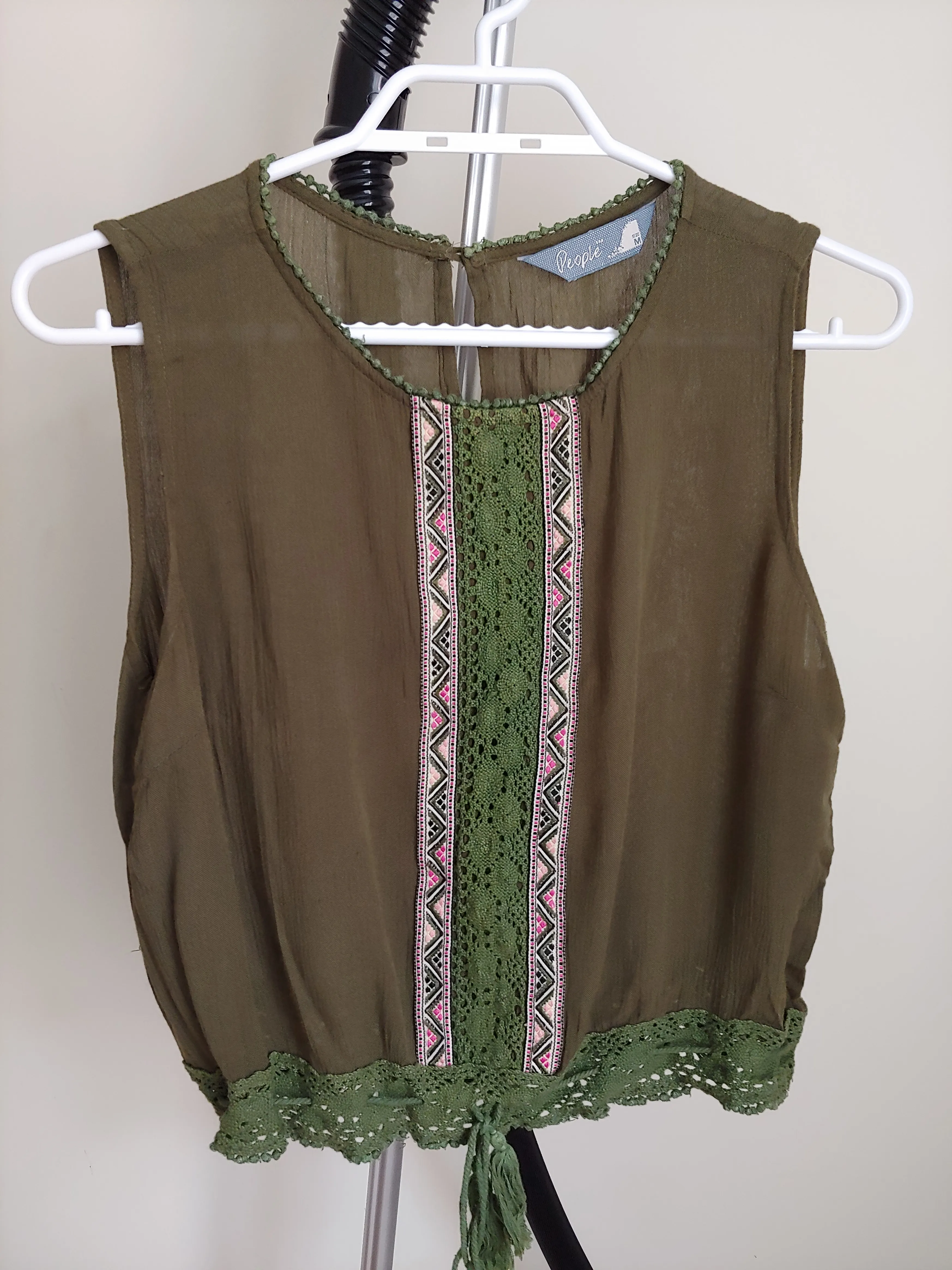Earthy! Mossy Green and Sweet Pink colour combo. Beautiful details and great for layering! Does not fit me :(. Pass on from a good friend.