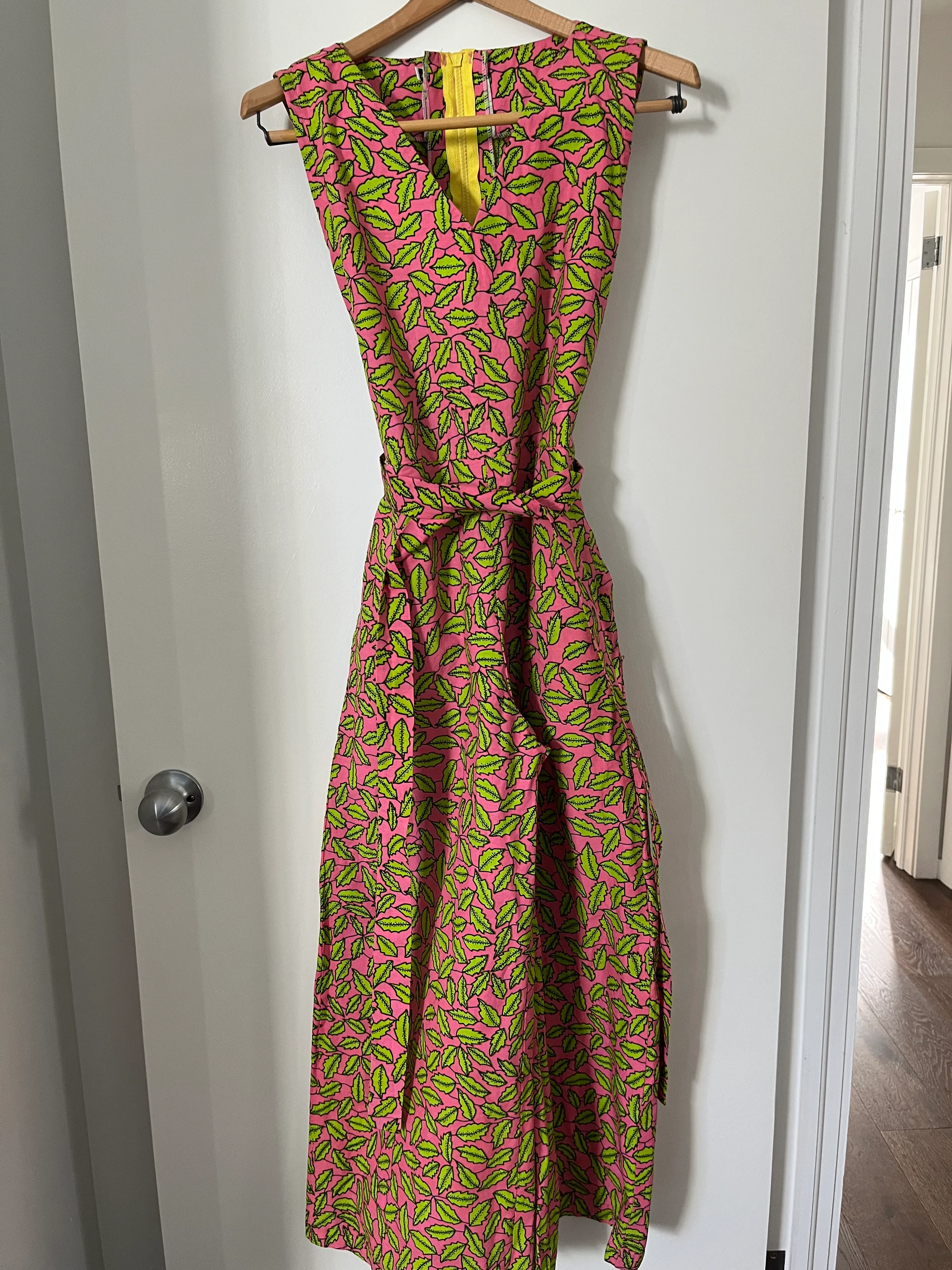 From the Canadian boutique Batik. Sleeveless jumpsuit. Wide-leg pants. Pink background with a lime green leaf print. Features a self-tie belt. Hidden zipper closure at the back. Fits snug for a small