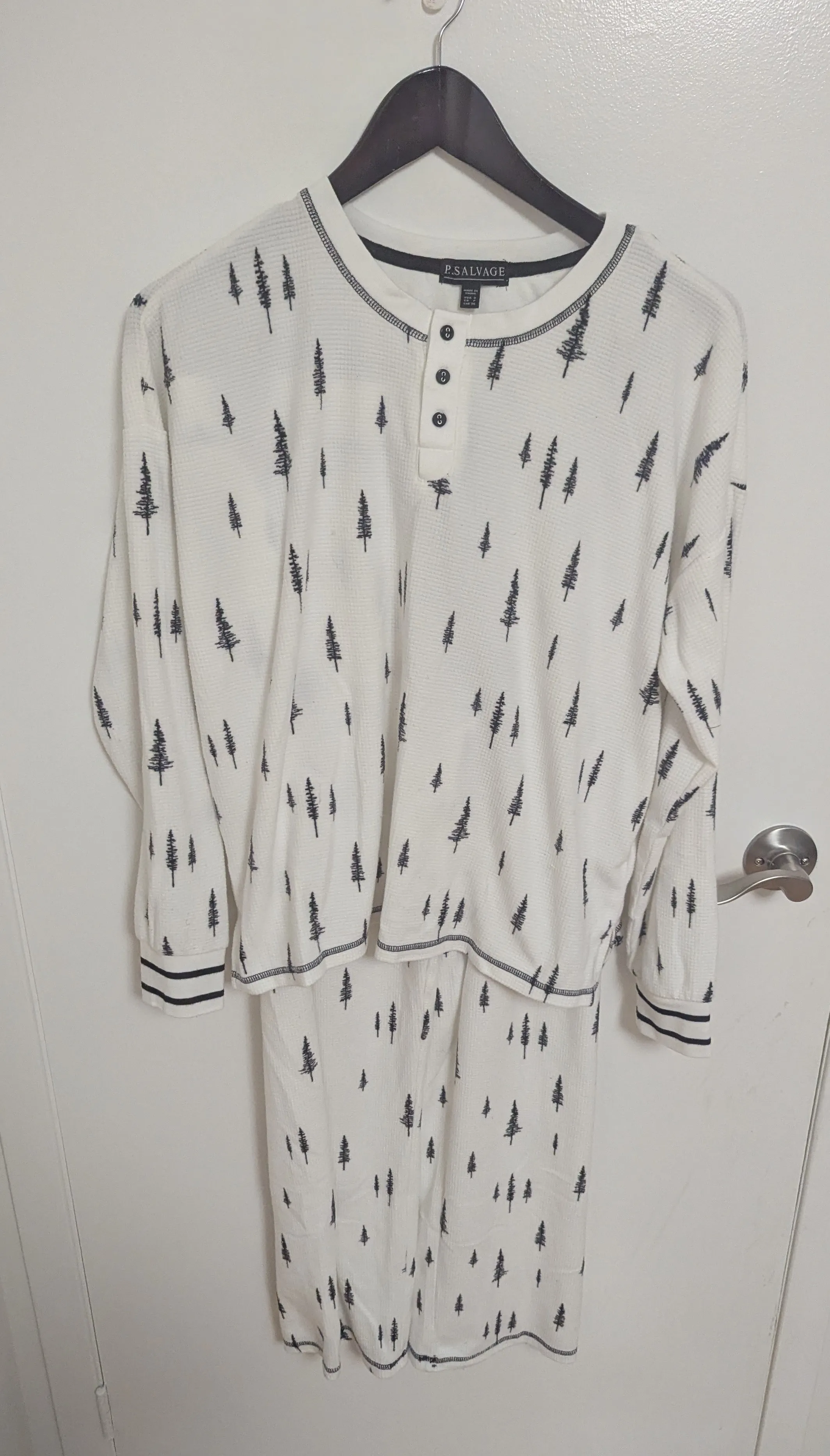 P.J. Salvage Pajama Set -Women's Size Small is perfect for cozy nights, featuring a long-sleeve top and matching bottoms in a size small with a festive tree pattern.