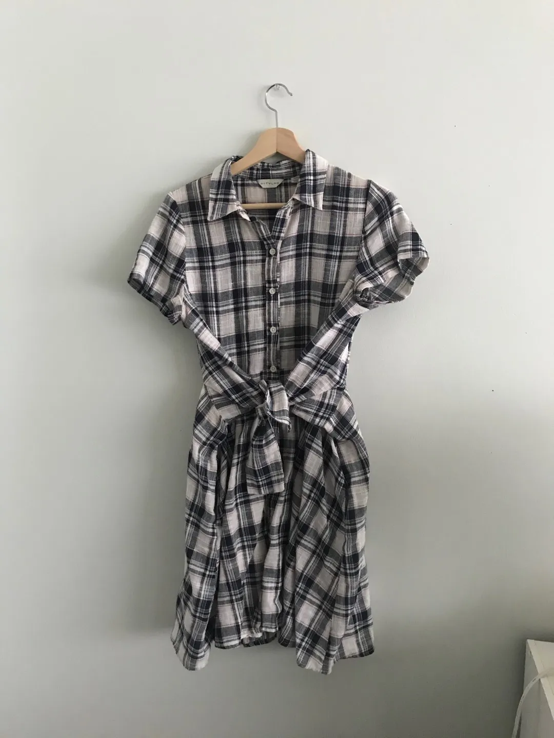 Has a tie waist detail, pockets, and the skirt is lined. Hits just above the knee on me (I’m 5’5”) Small stain on tie (see pic) hardly noticeable, especially while worn. Bought from Anthropologie a few years ago for $150. An adorable and well loved garment. Main fabric is 100%cotton and lining is a soft rayon.