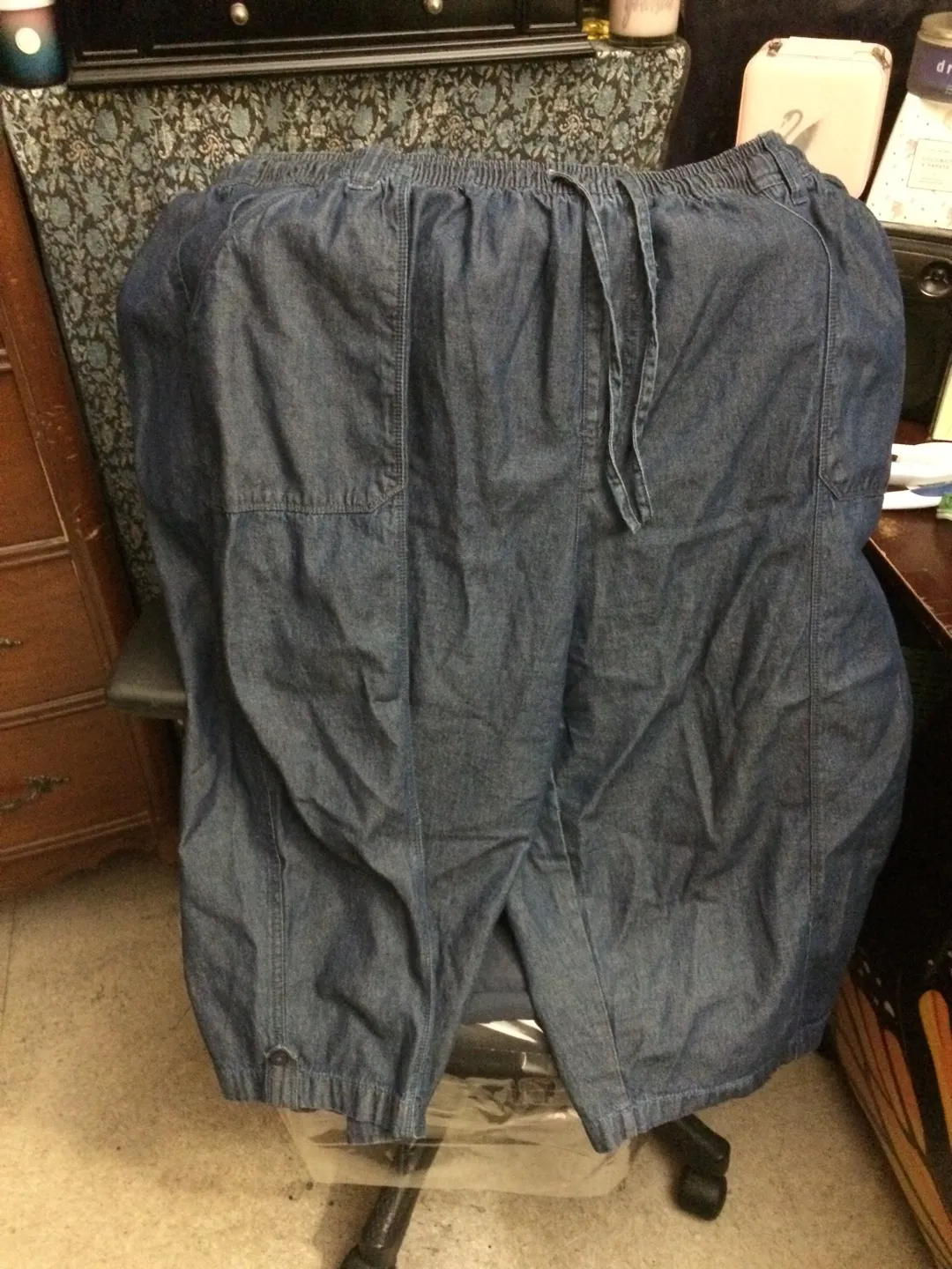 Very, very large and baggy, plus size 3x, light jean texture, pockets, elastic pull string waist, most likely fit for petite (short) sizes. Use for lounging, gardening, etc. Karen Scott brand, 100% cotton.