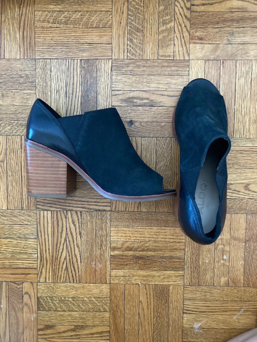 Size 7 and fits true to size. Not sure exactly how high the heel is, ~3”?