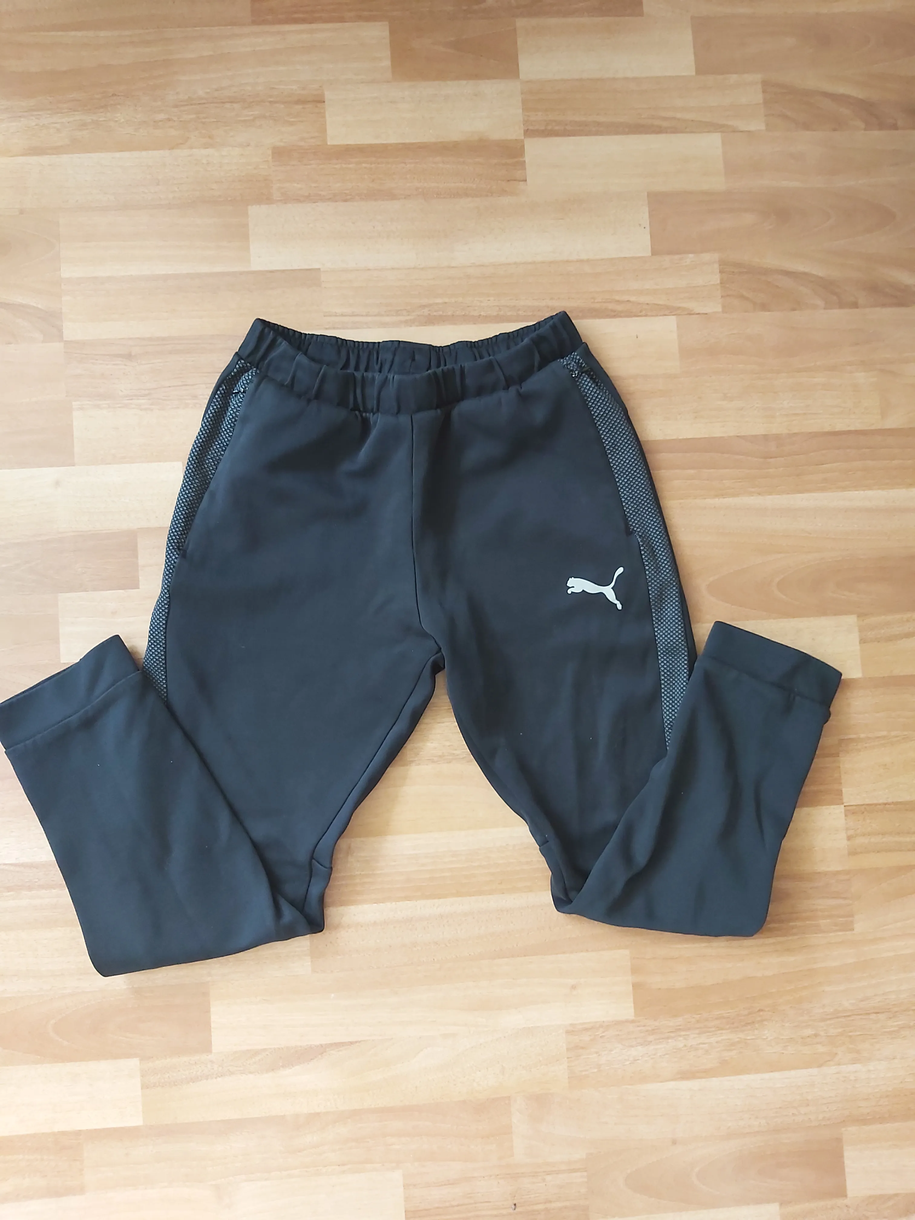 Size medium PUMA black joggers with grey detailing on the sides and zippered pockets. Unisex.