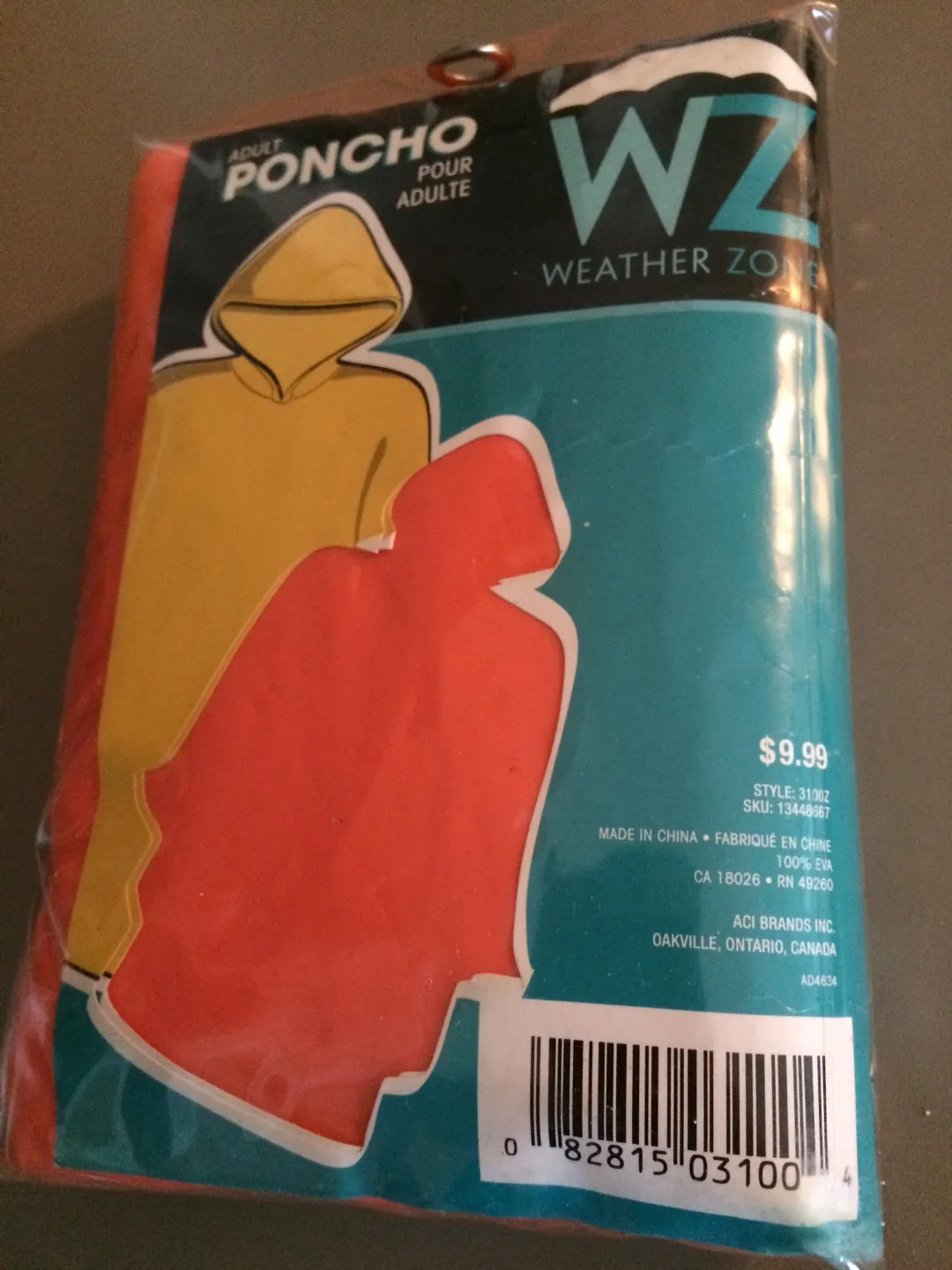 Adult. One size. Great to have on hand if you unexpectedly get caught in the rain. Good for camping, cycling, hiking, etc.