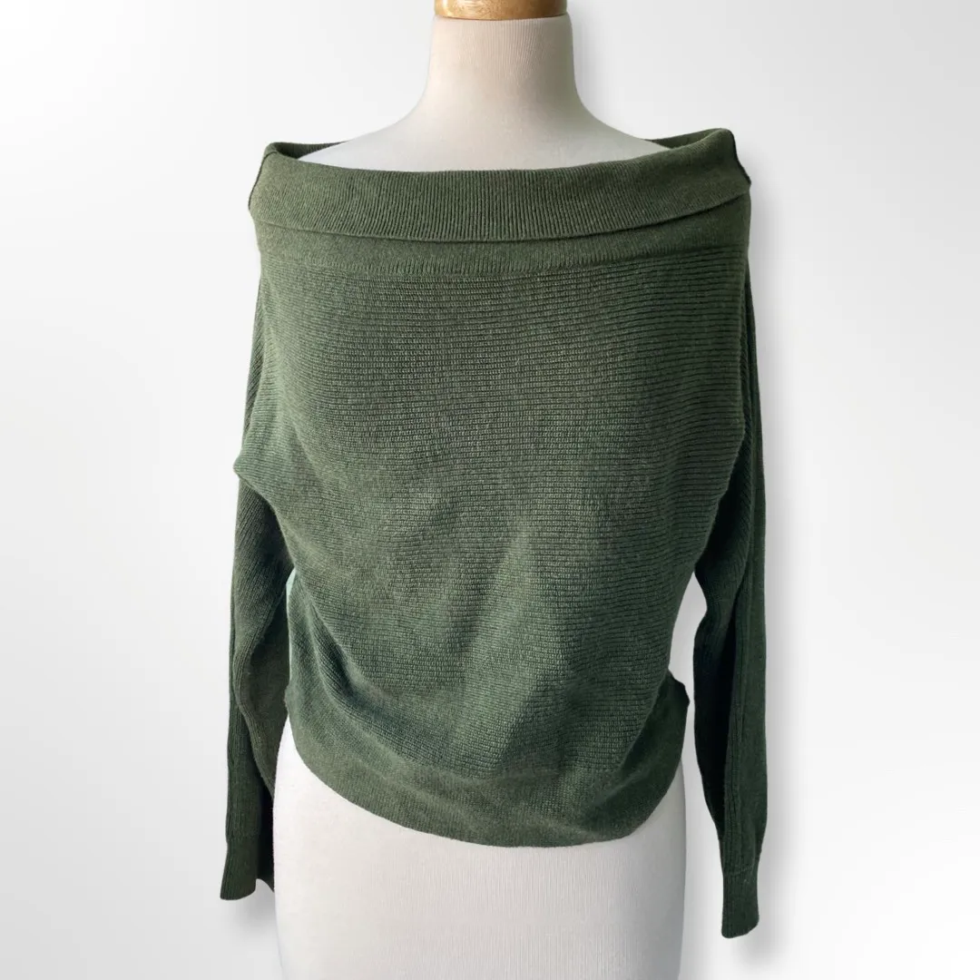 off the shoulder by Rebecca Minkoff! Cotton cashmere blend. Super soft and very flattering! Unfortunately the seam on the bottom near the waist has come apart a bit (see photo) - super easy fix though. Marked sized xs but would probably fit a small as well.
