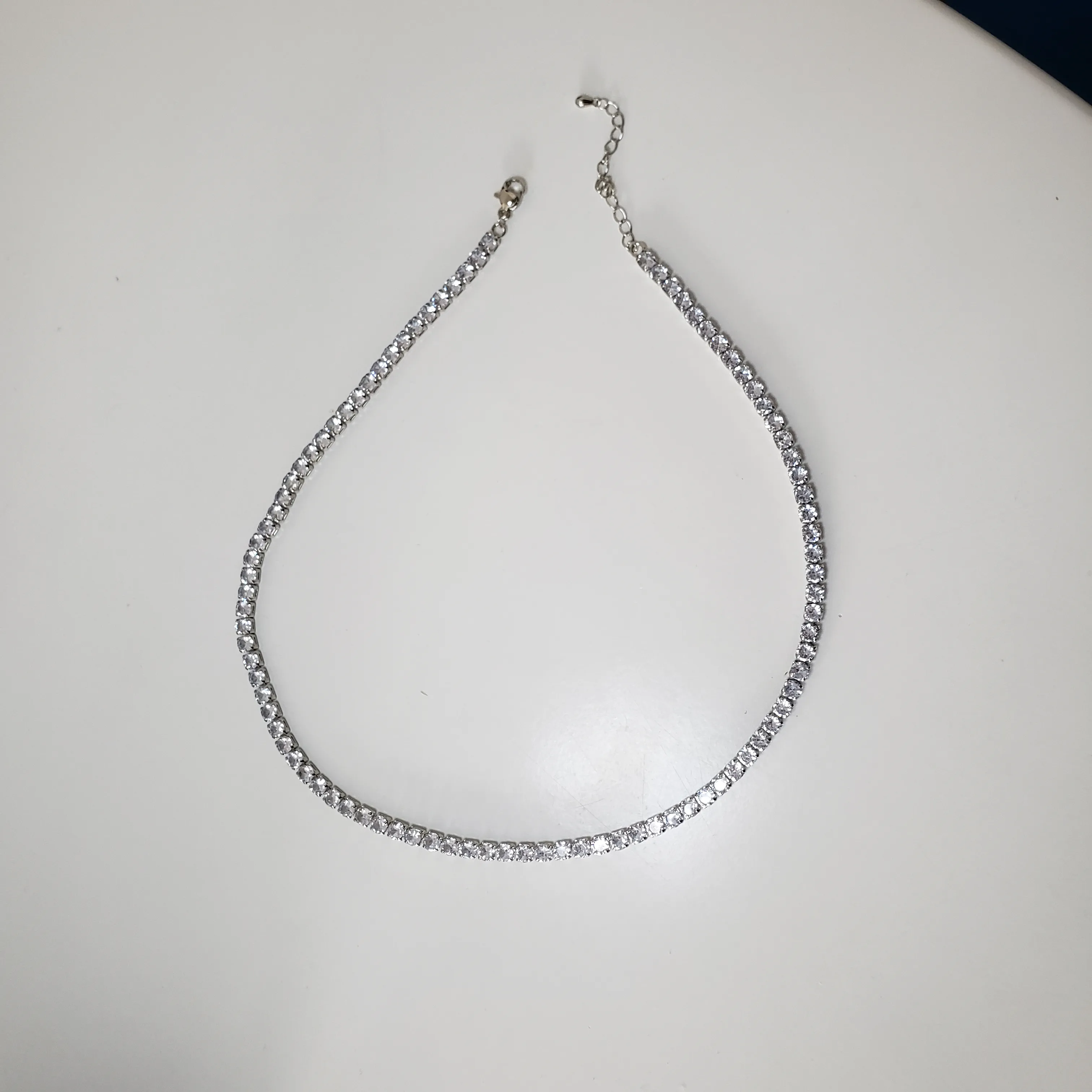 Looks like a diamond tennis necklace. Has an extender chain so it can be worn longer or shorter. Approximately 18 to 19 inches. Brand new, never worn.