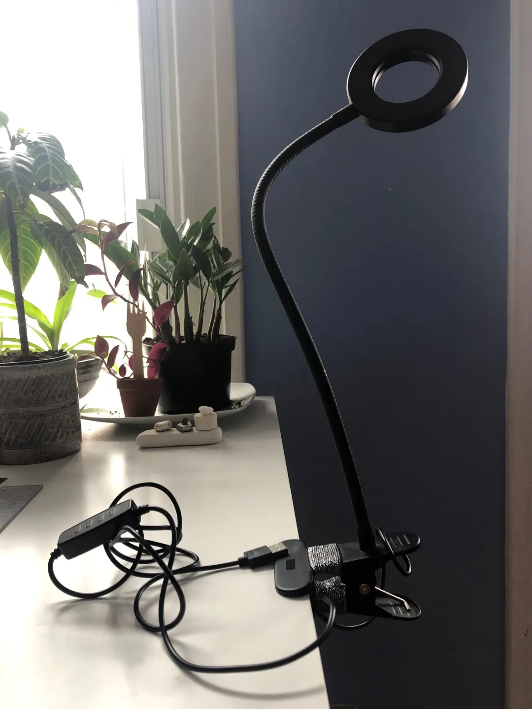 Clips on to desk etc, powered by usb, several settings. Got it early pandemic and used it like 3 times.