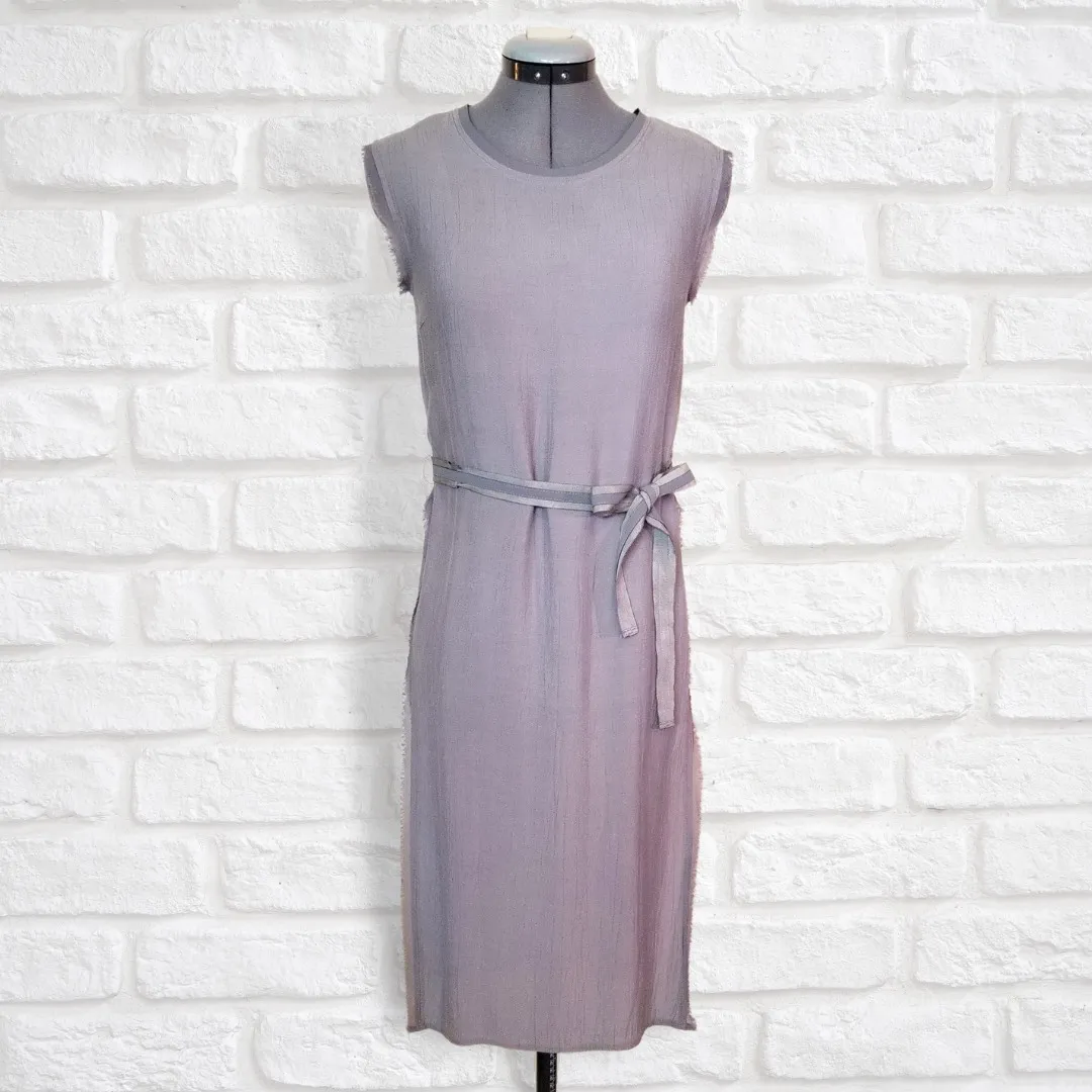Sleeveless silver-grey crinkle tunic with high side slits and raw edge detail. Can be worn with or without included belt.
