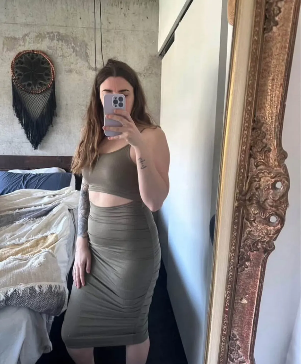 Worn once Size medium. Brand is Love, fire Muted sage green midi dress with front and back cut out Has lots of stretch, will fit medium-large