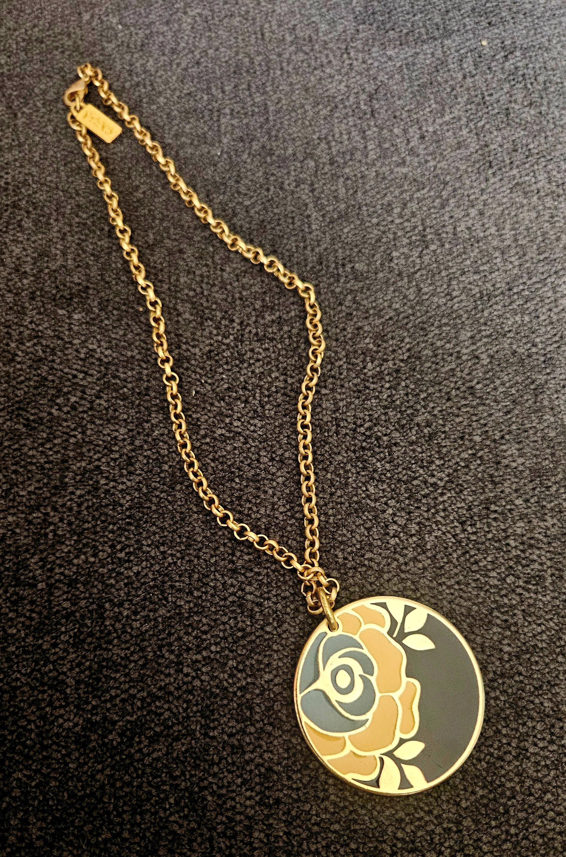 2 necklaces, gold-tone chains. Pendant styles vary: round black enamel with gold leaf design and round black enamel with floral design on other side., second necklace features a small bow pendant with pastel coloured crystals. Unique and stylish.