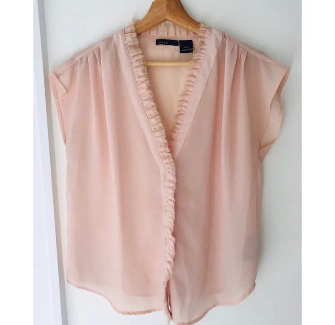 Gorgeous, sheer baby pink blouse with cap sleeves and frayed collar.