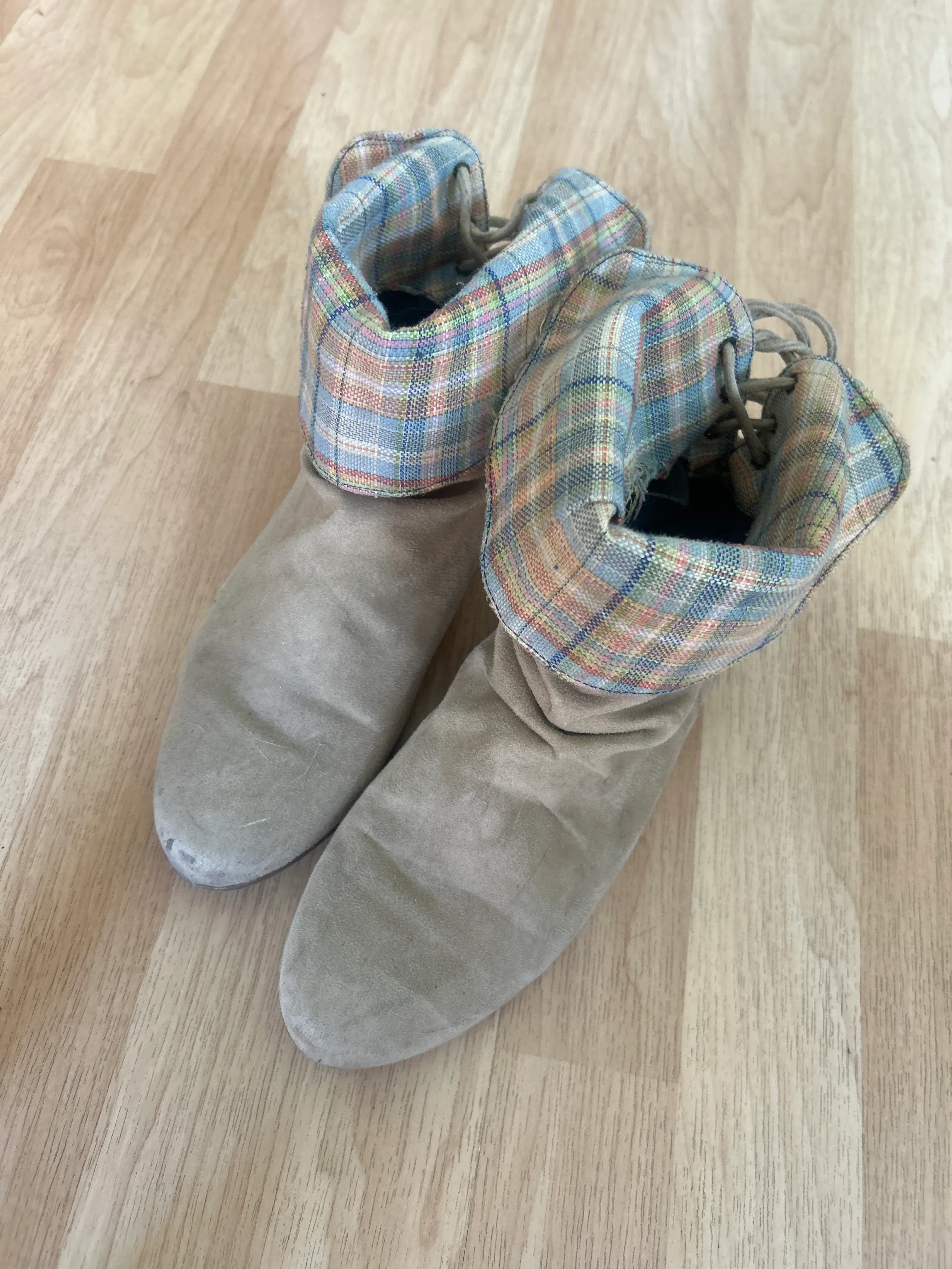 Tan suede booties that were originally from Spain. Great quality - I just don’t reach for them any more. Size 38