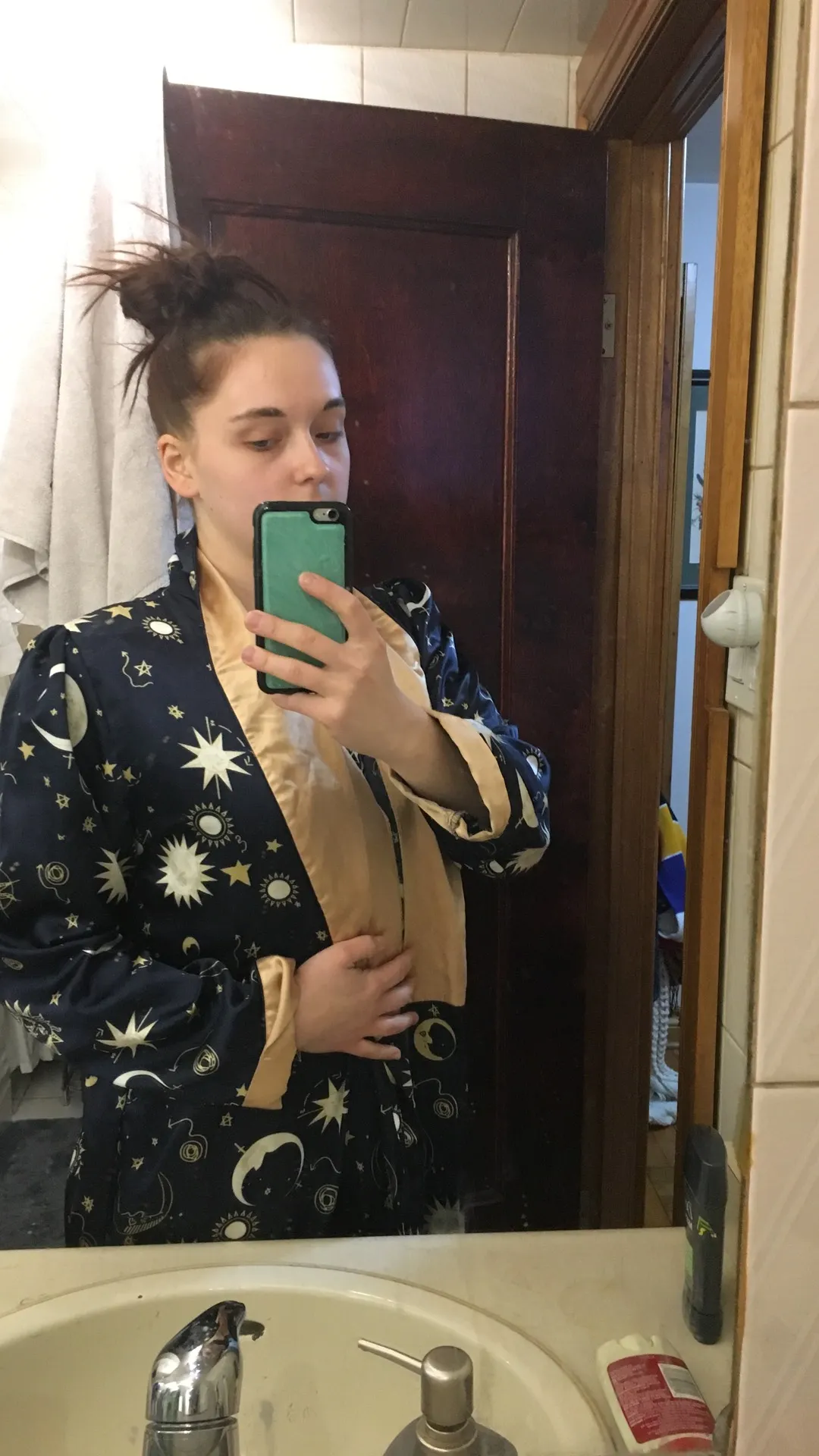 This gown is gorgeous, I just don’t wear a house coat at home! Poly/cotton blend. Feels silky. Almost floor length depending on how tall you are. Comes with sash belt