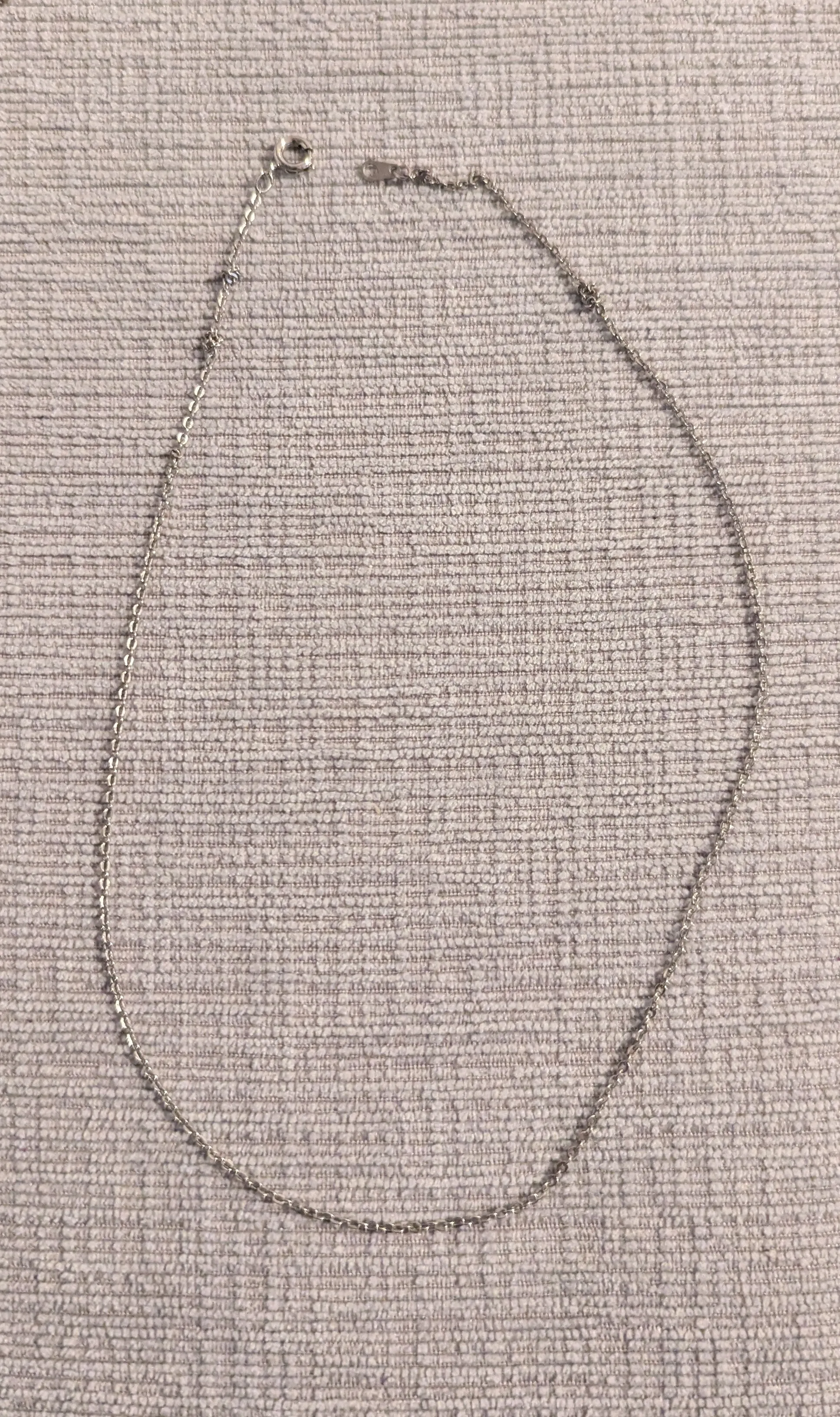Delicate silver chain necklace. Features small, evenly spaced accents along the chain. Lobster clasp closure that needs repair.