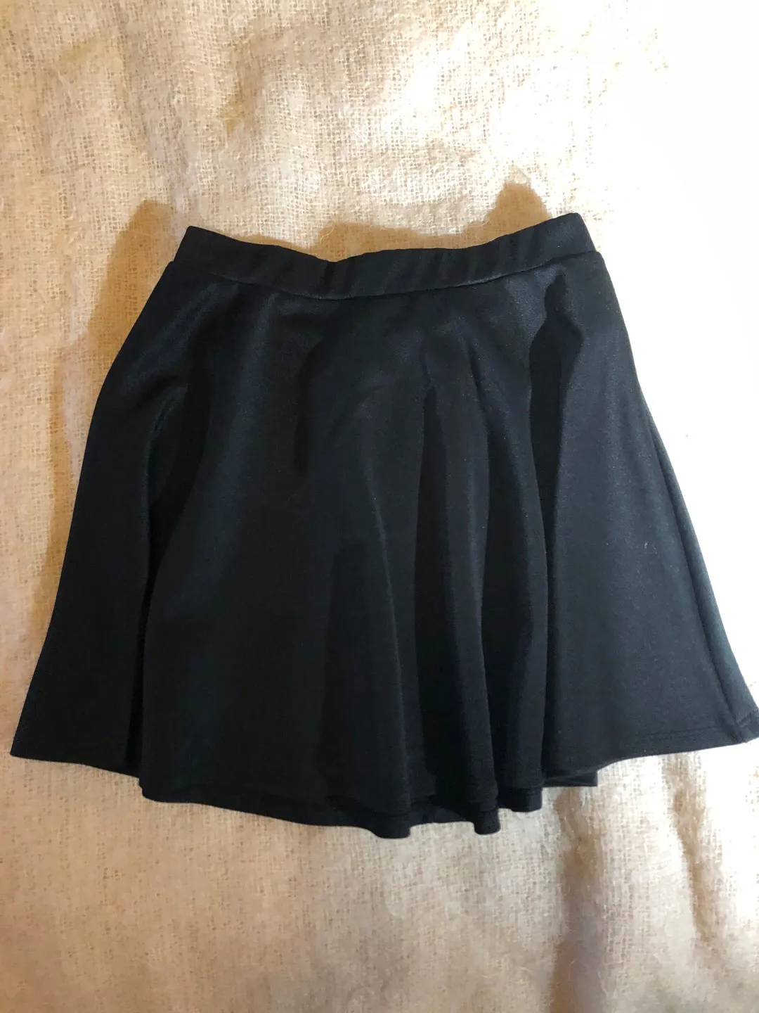 Slightly shiny, thick material. Skater style skirt. Can also fit XS.