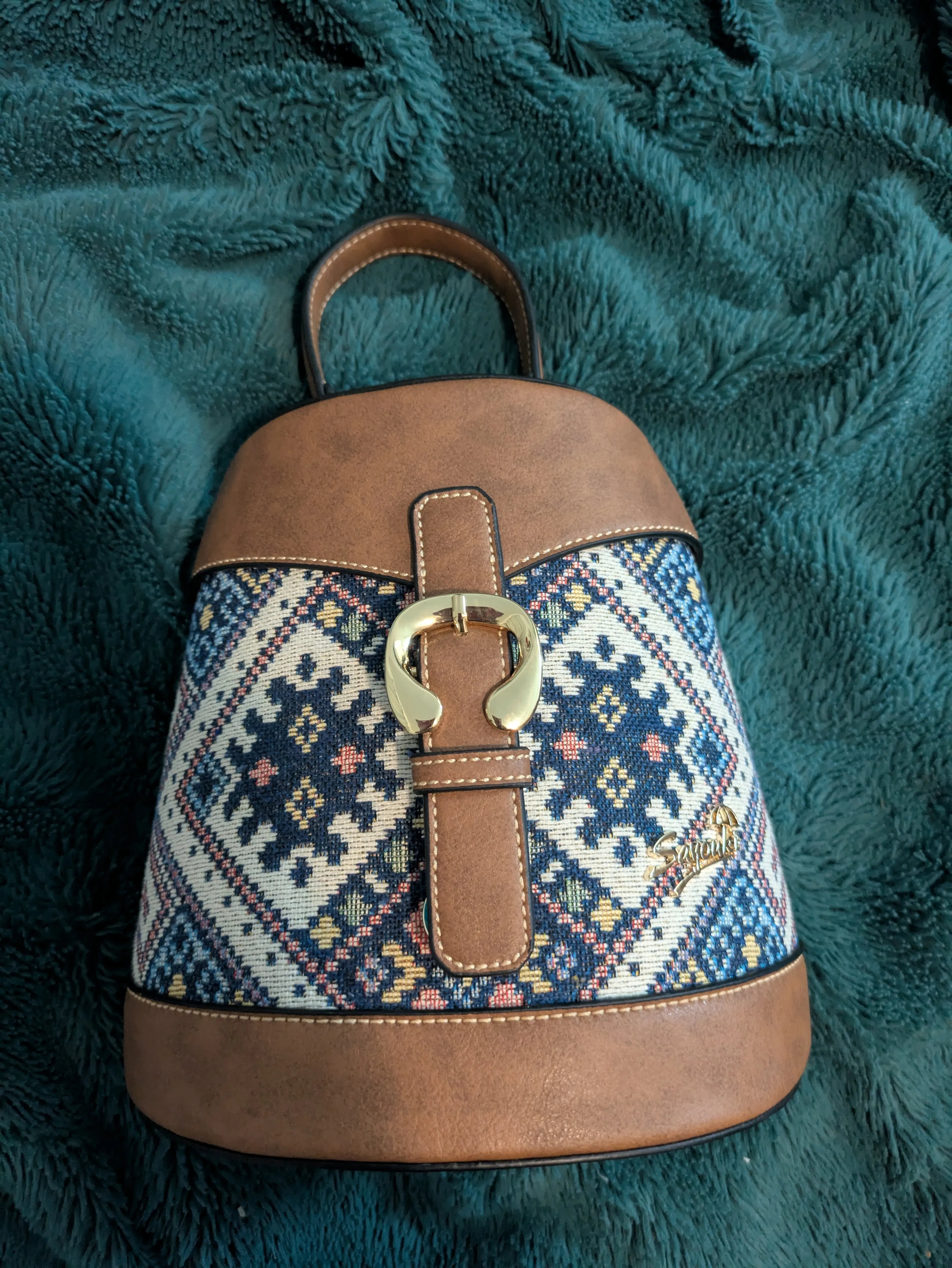 A small purse, with a top handle for holding. Cute look, but wasn't practical for me. Has hardware for using a longer cross body strap - but I don't have the strap anymore. Would be usable with a purchased crossbody strap :)