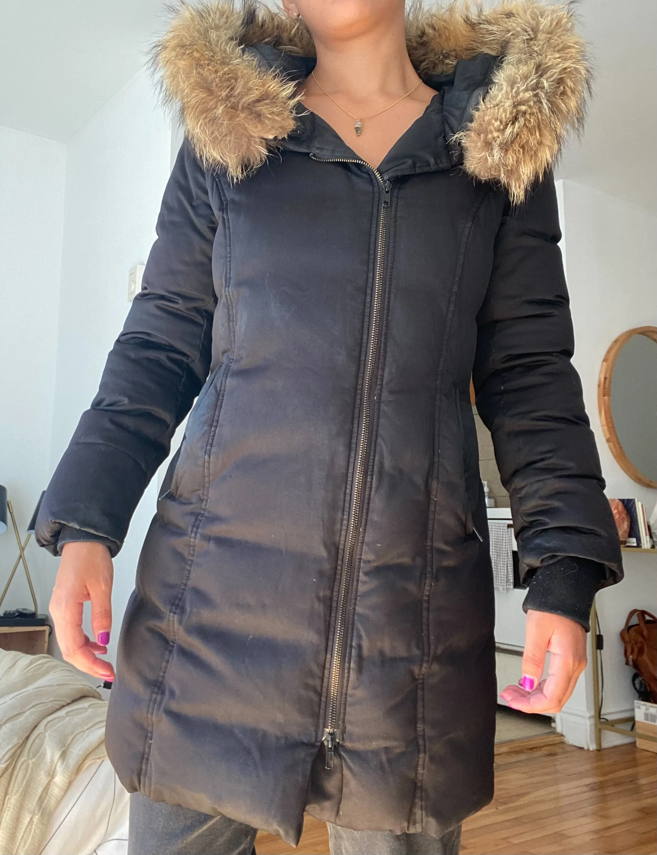 Black. Well loved but lots of life left. Some wear and tear: there is a hole in one of the pockets and some wear around the pockets as well.