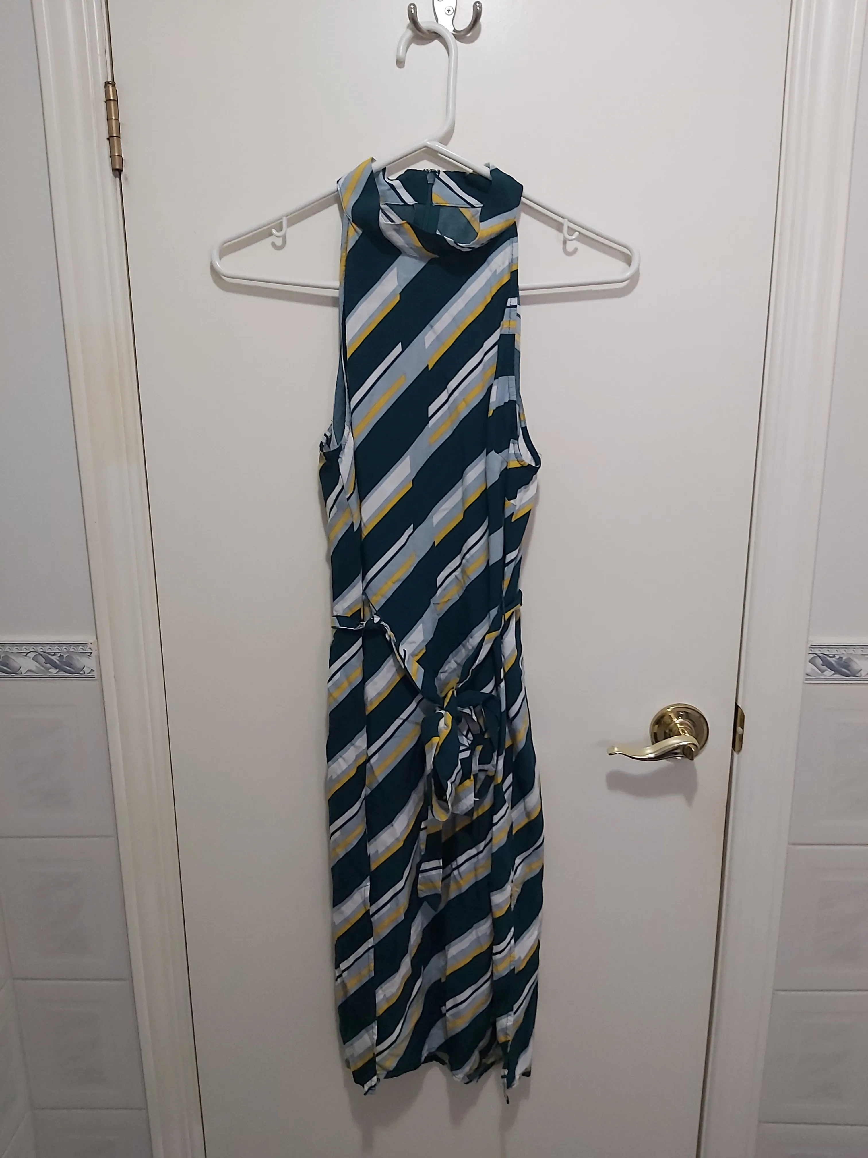 Size extra large striped sleeveless dress. Colours are white, green/blue, yellow. Has small slits on the bottom sides. Includes the matching belt.