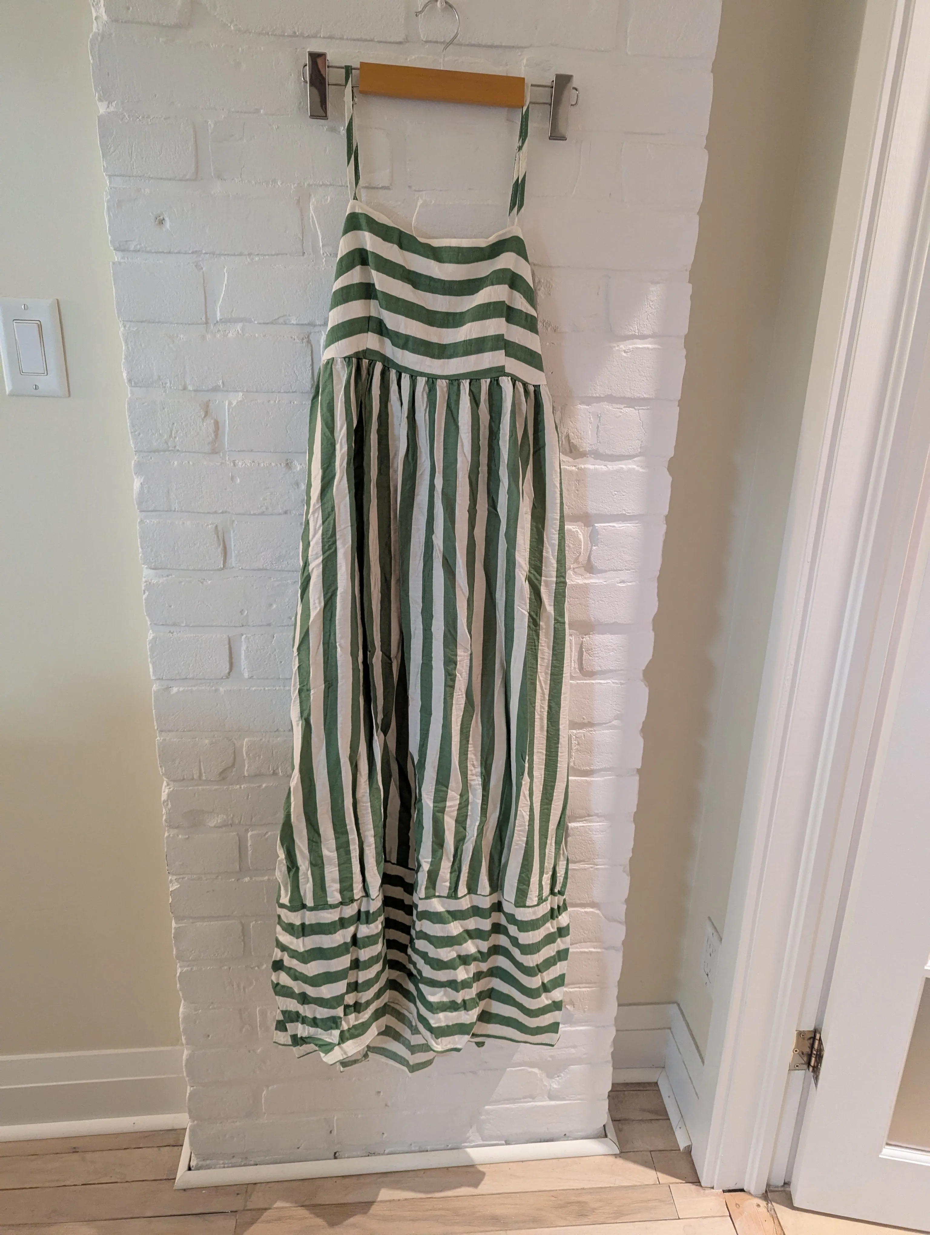 Light material, tie back. Was marked a medium but fits more like a large. New (ordered it online but doesn't fit me)