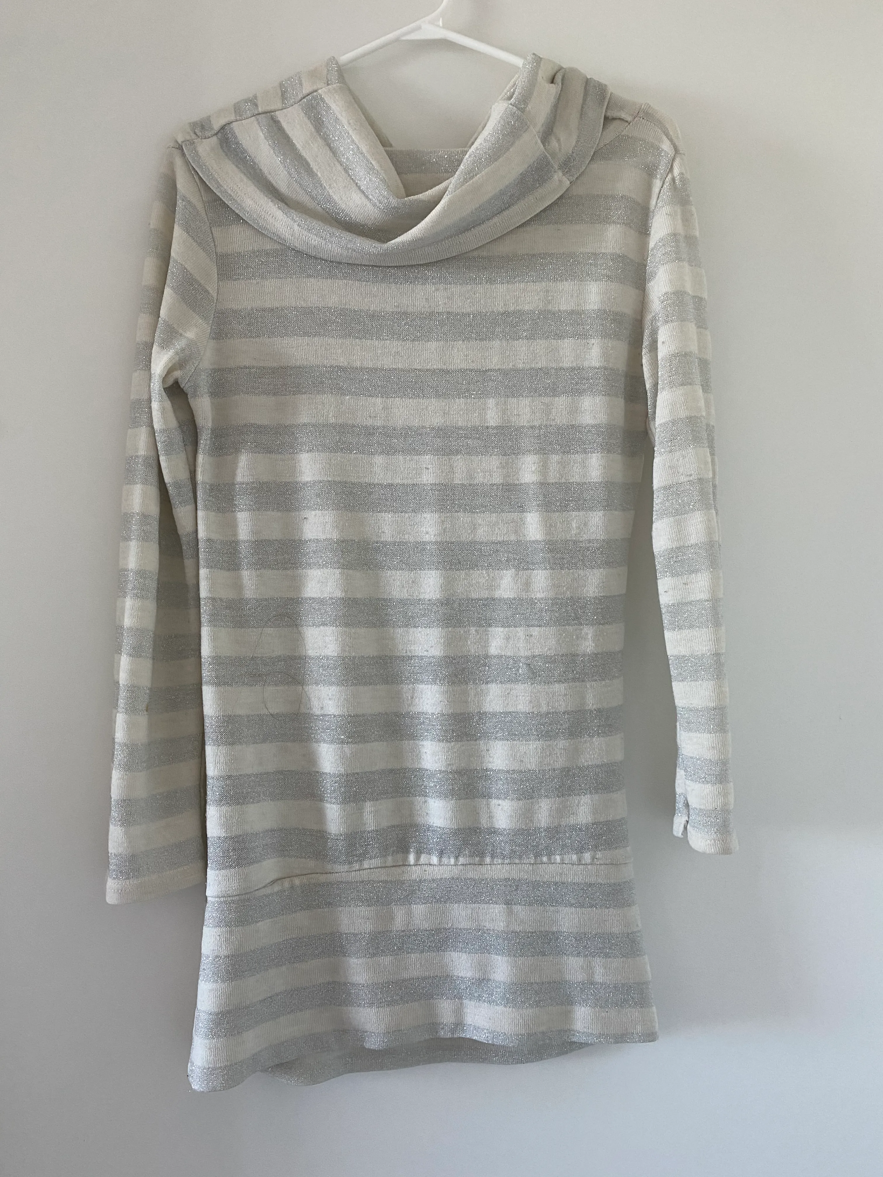 This is a long-sleeved dress, perfect for adding a touch of sparkle to your casual wardrobe! It features a stylish cowl neck and an eye-catching silver and white striped pattern.