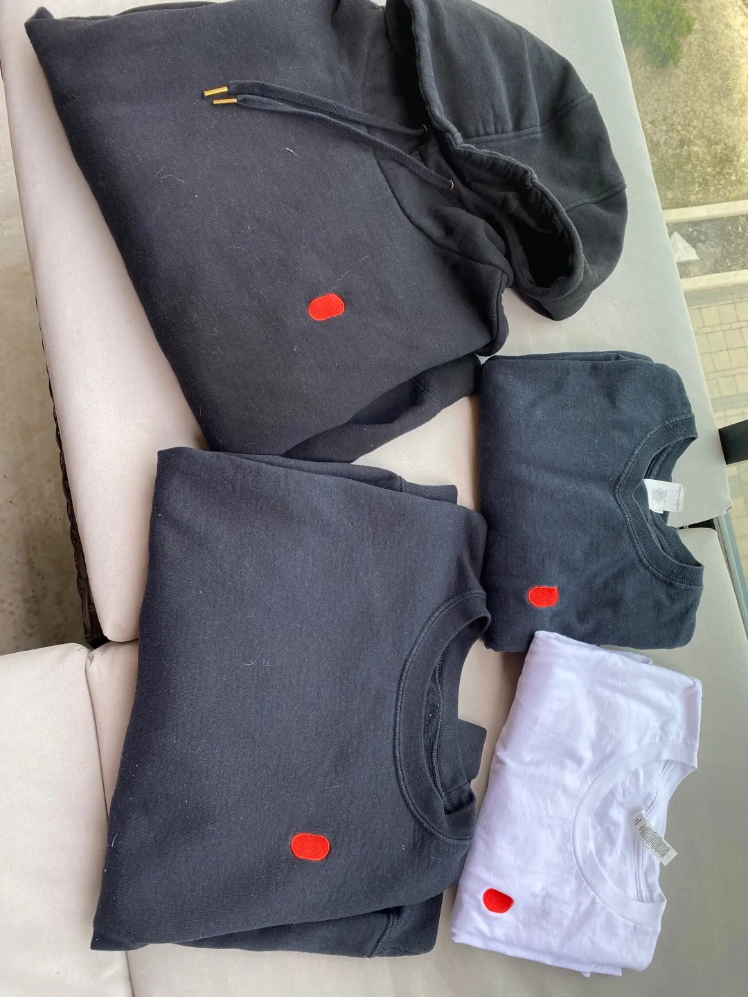 Hoody 60 and Small Crew neck 50 and Small 2 black tees 23 and Small White tee 23 and Small