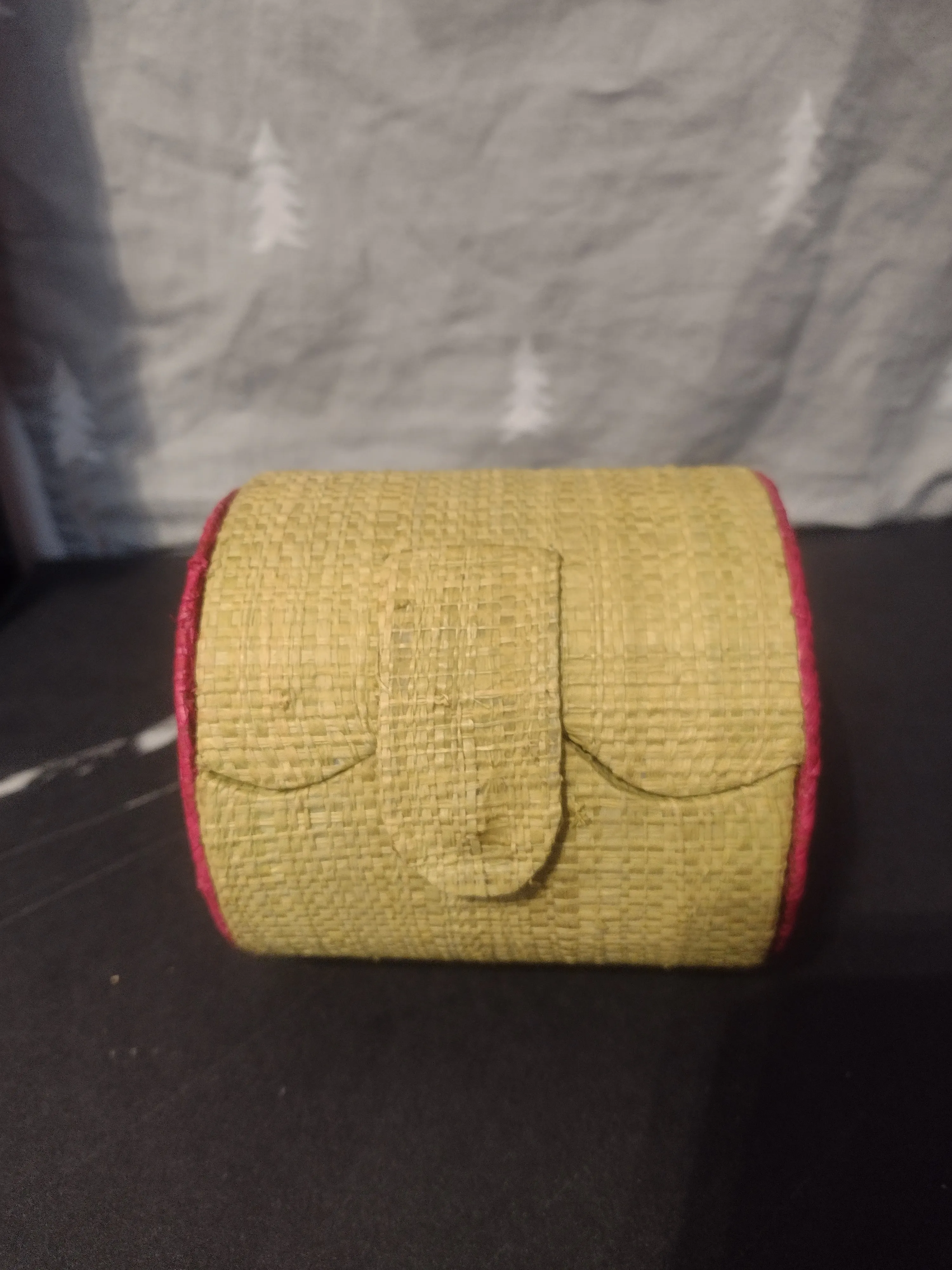 Green and hot pink straw travel box to carry your jewelry and display them nicely in your destination. The clasp has a stain (last pix)