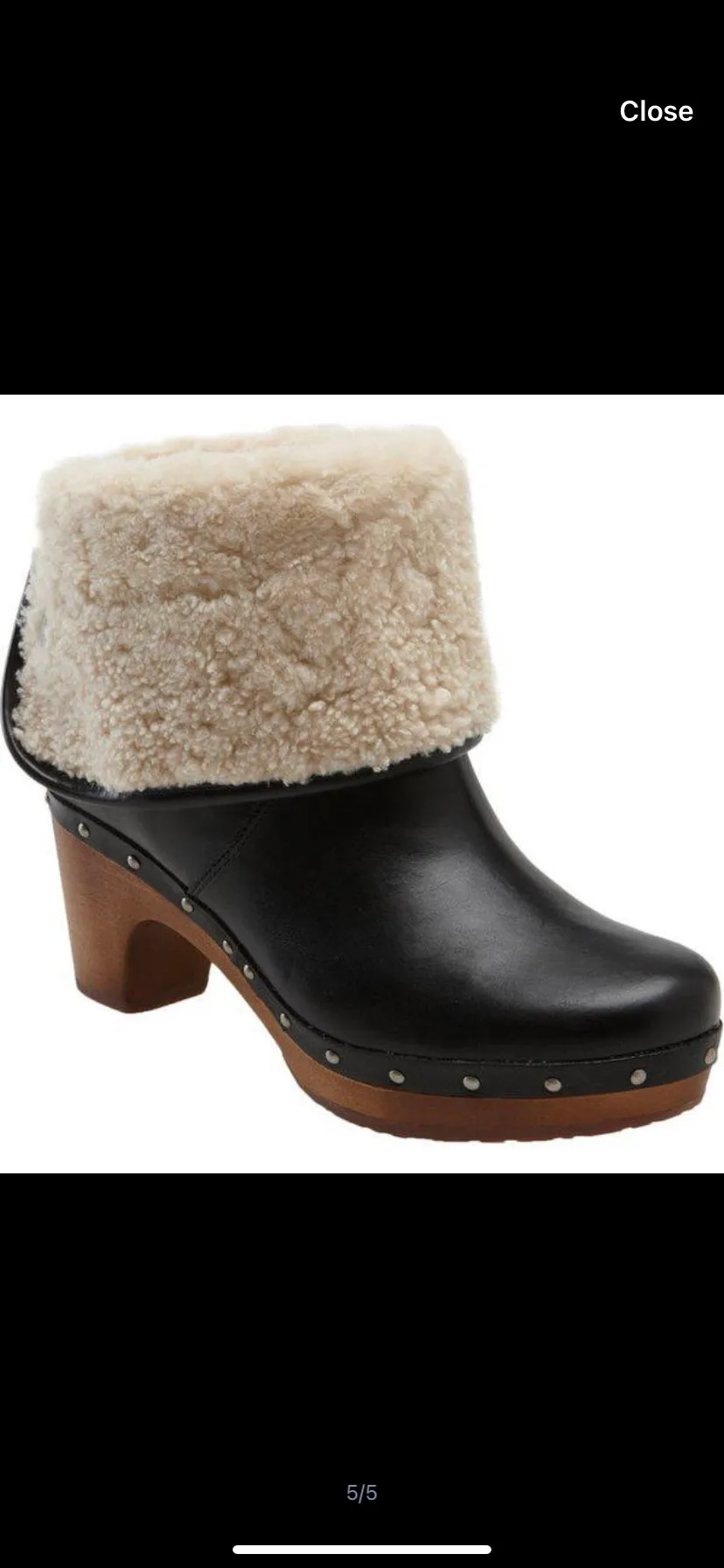 Shearling-lined cuff details a rich suede ankle boot balanced on a wooden heel. Cuff can be worn down or up to vary the look.