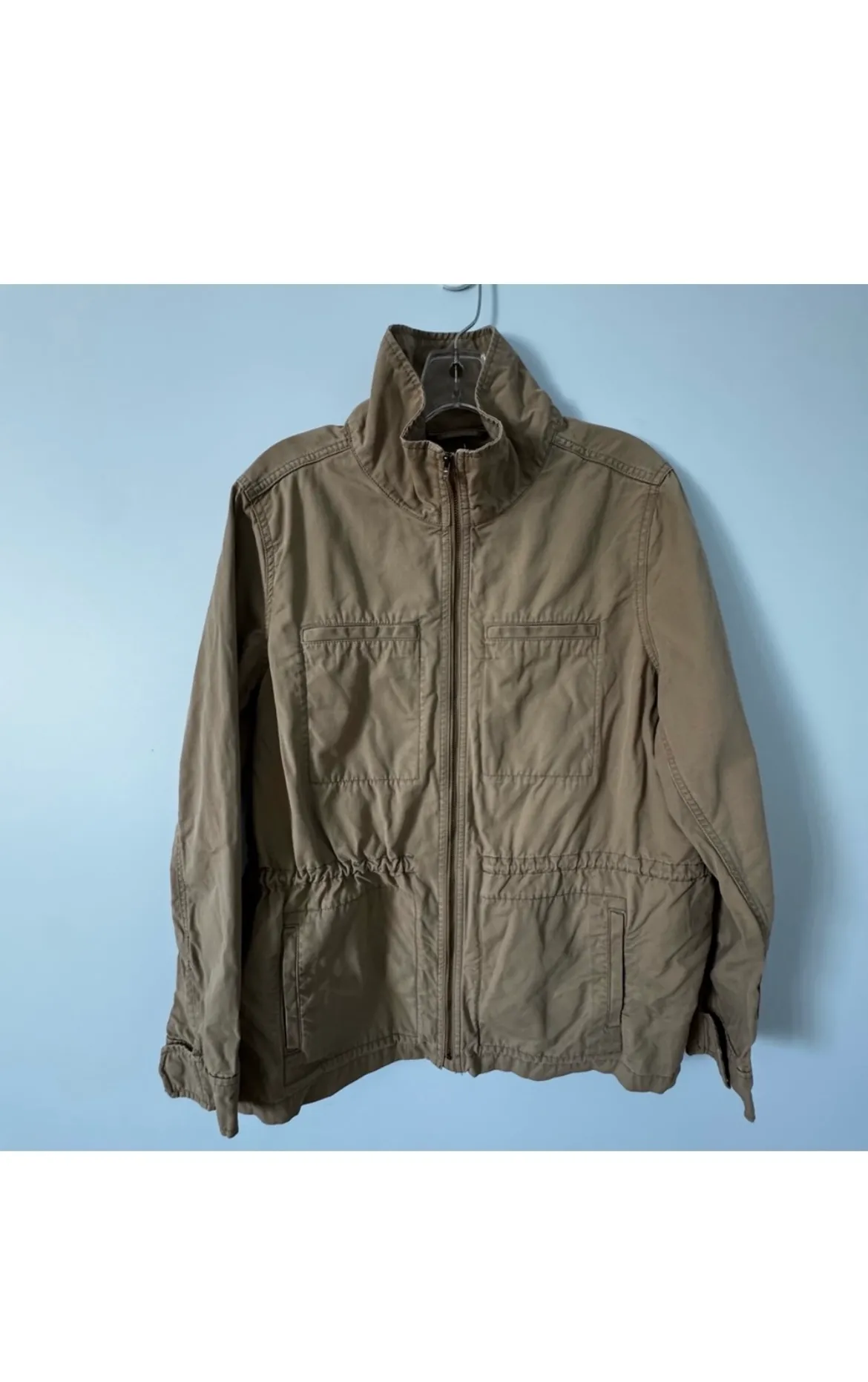 Classic Gap utility jacket in neutral khaki/tan. • Size XL • 100% cotton • Full-zip front • Stand collar, elastic waist detail • Four functional front pockets • Chest ~22–23” • Length ~28–29”