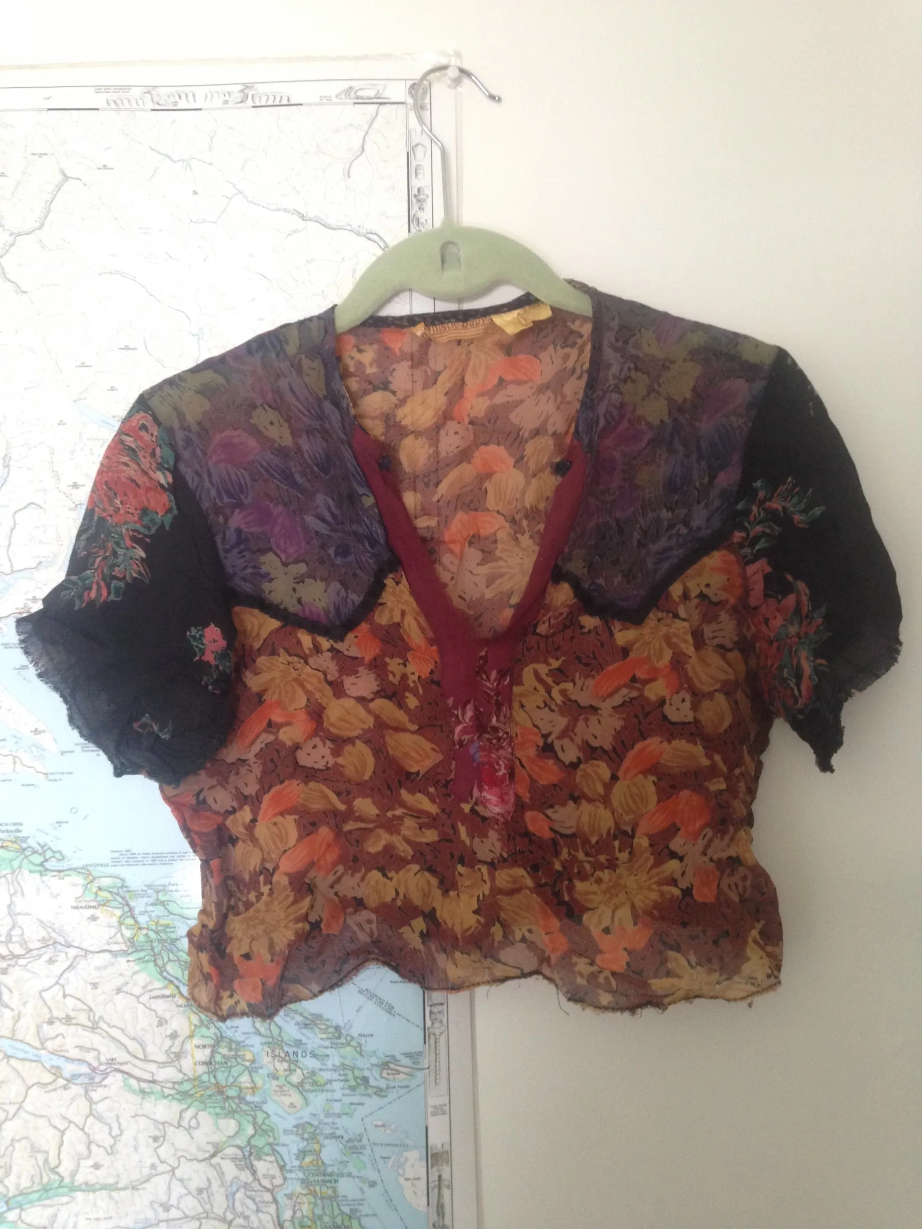 Size xs or small, 100% rayon. Sheer The arms and bottom hem are a little raw, see second and third picture. But this is such a unique piece, patchwork style shirt that can be dressed up or down.