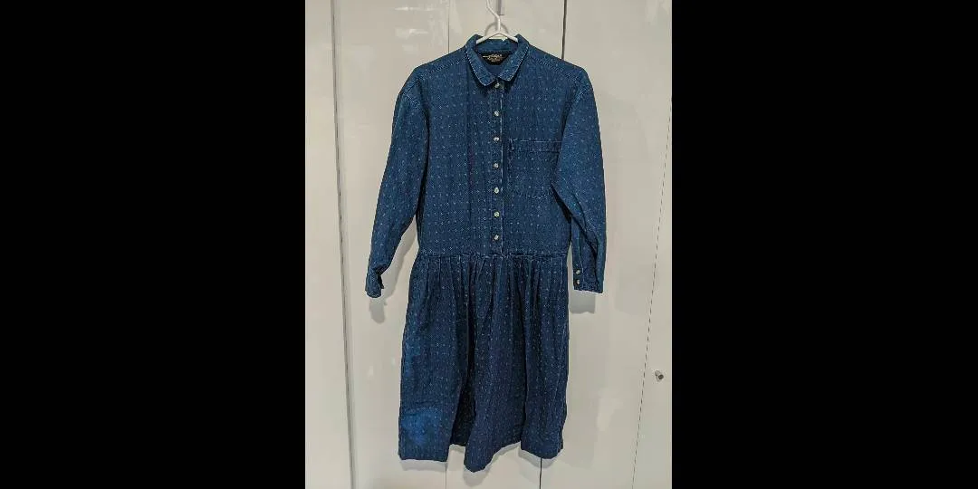 EUC Vintage 80s denim dress with collar, pocket, buttons and drop waist Size small Eddie Bauer brand Indigo coloured denim with subtle diamond pattern 100% cotton