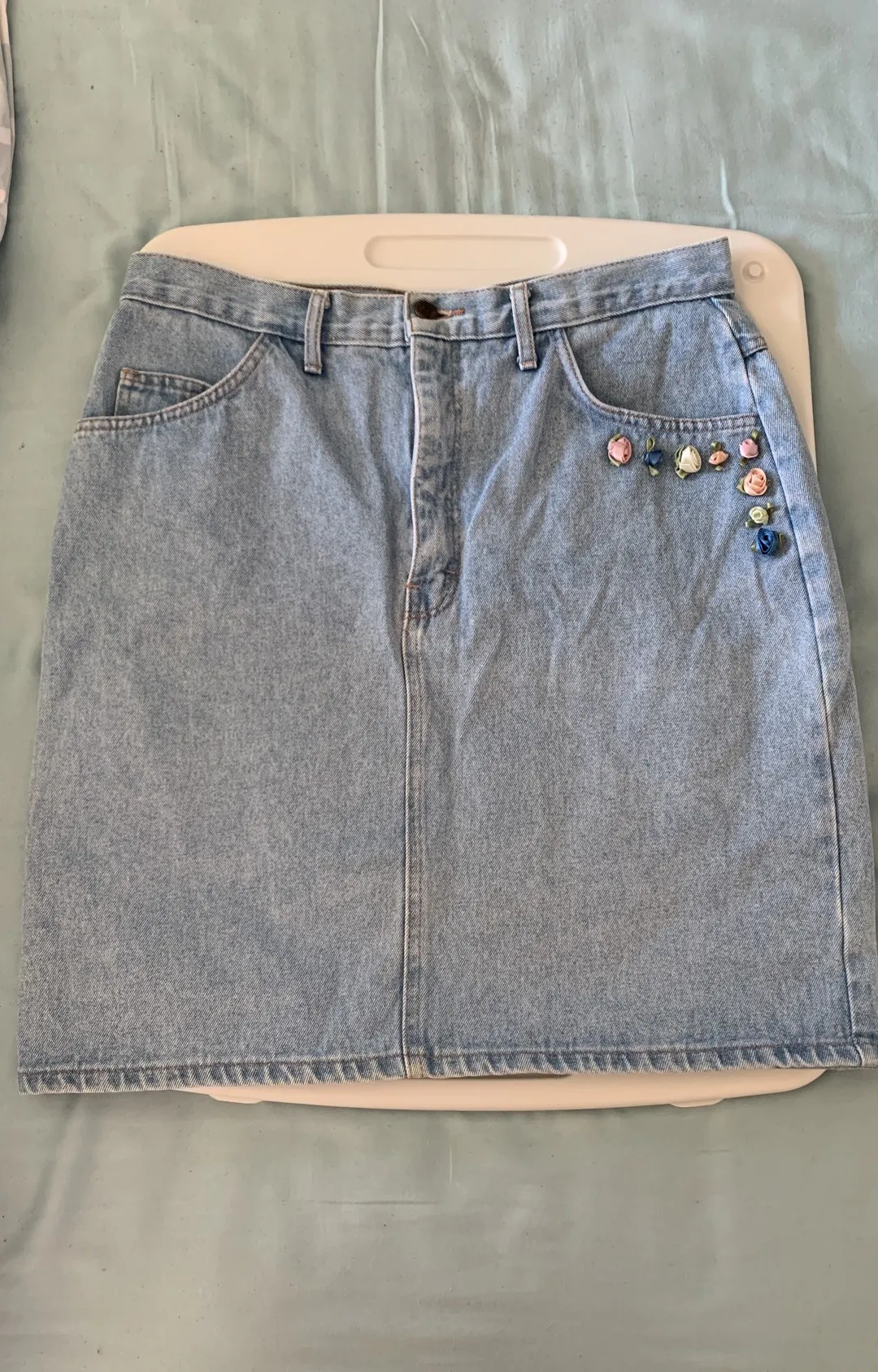 Fits like a size 12! Canadian made jean skirt with floral details. $20 value.