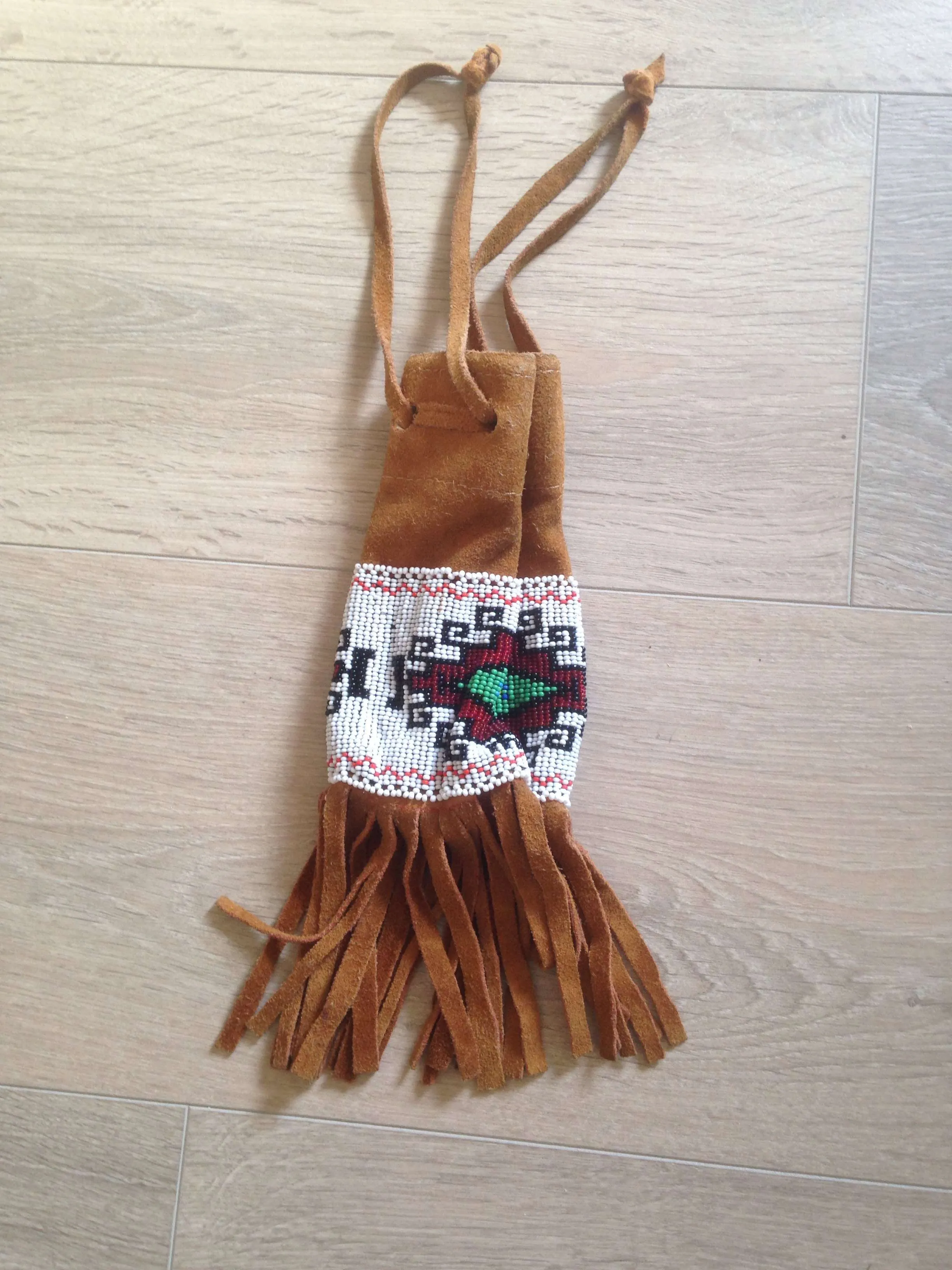 Suede fringed and hand beaded purse. The inside where the drawstrings go have more recently been professionally reinforced It's in great condition, my mom's bag from the 70's. The suede has aged a bit, as you can see in the second picture. Deodorant for scale