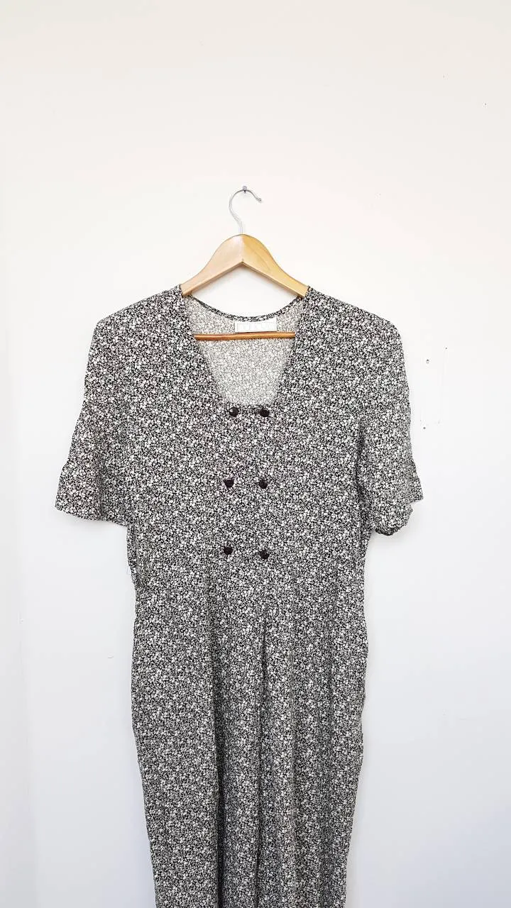 1970s Nancy G, black and white floral jumpsuit, made in Canada. Features wide pant legs, 2 pockets, shoulder pads and a button up front.