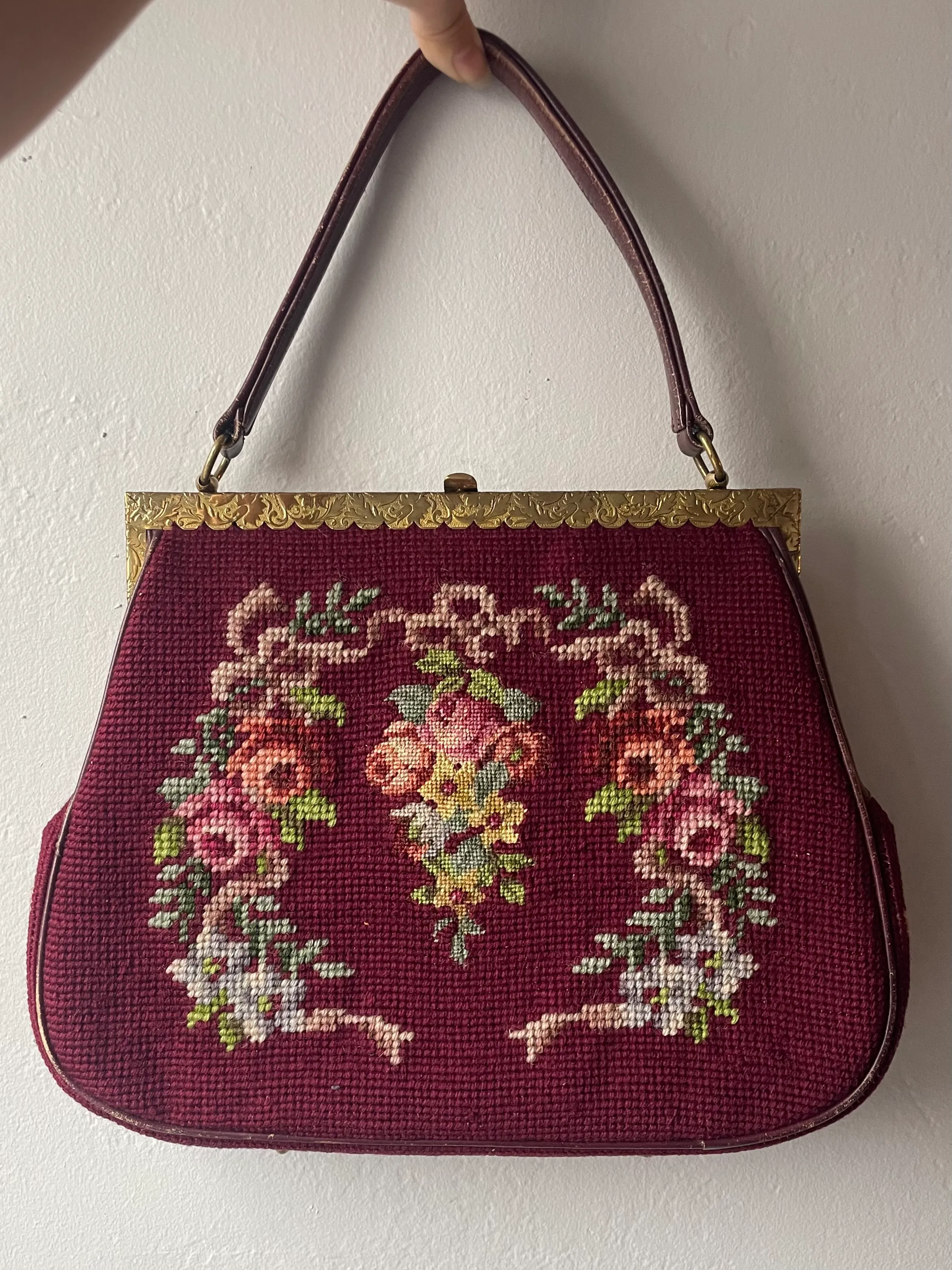 Vintage needle stitch maroon purse with gold hardware. Cute purse i just don’t reach for it.