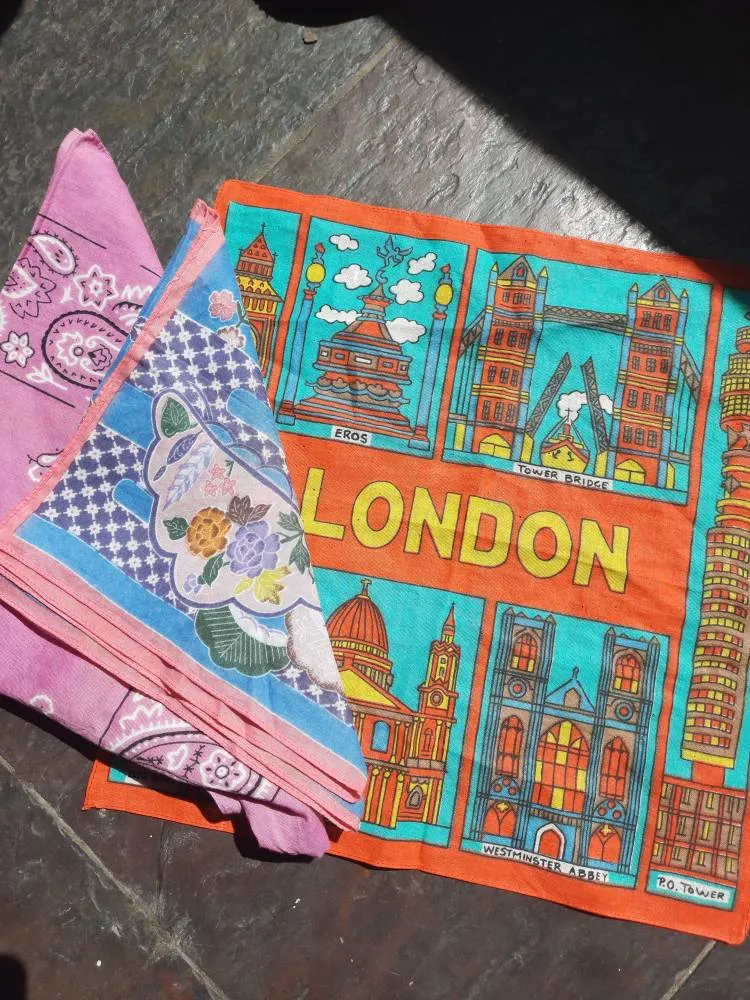 Trading as a group! The London one has a bunch of small holes as there were once pins all over it The pink standard bandanna is not vintage * other 2 are